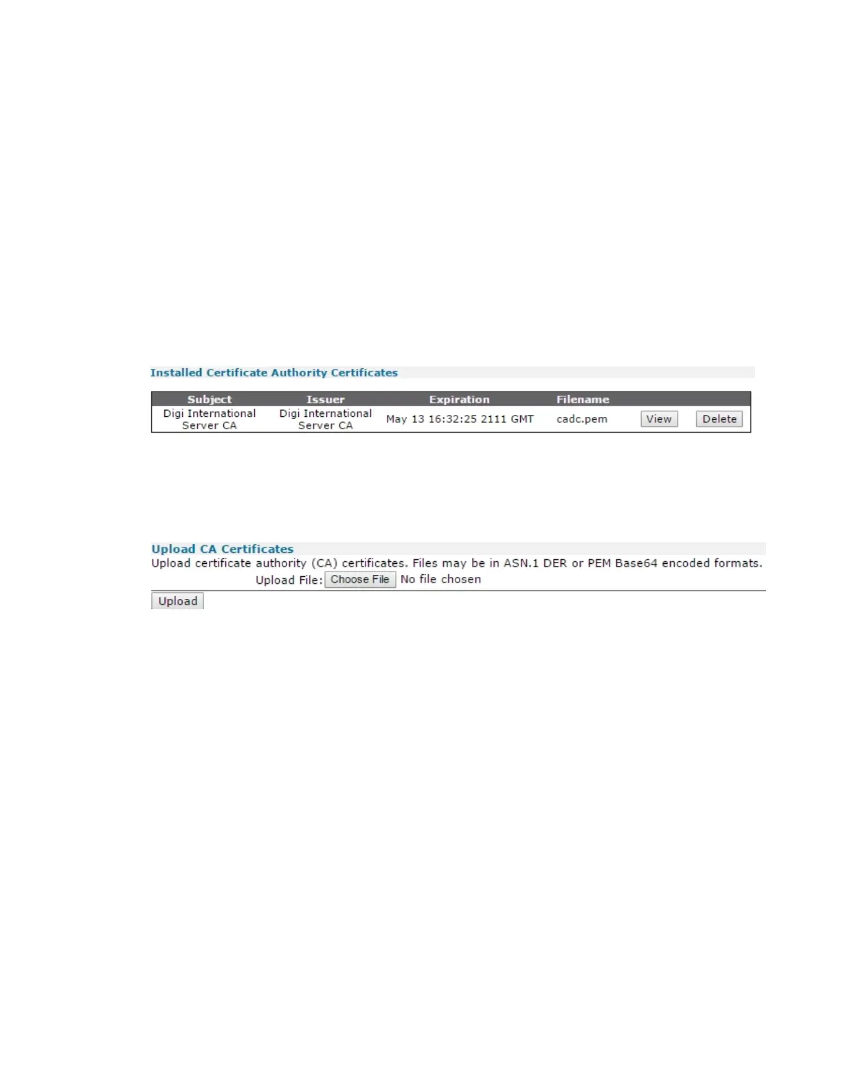Use the Choose File and Upload buttons to upload CA Certificates from a host PC onto the router.