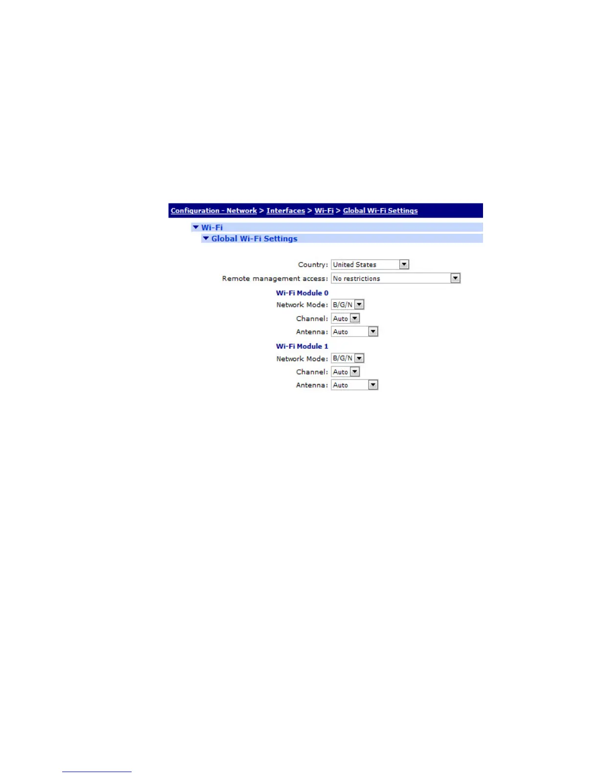 The Configuration > Network > Interfaces > Wi-Fi section of the web interface that contains the