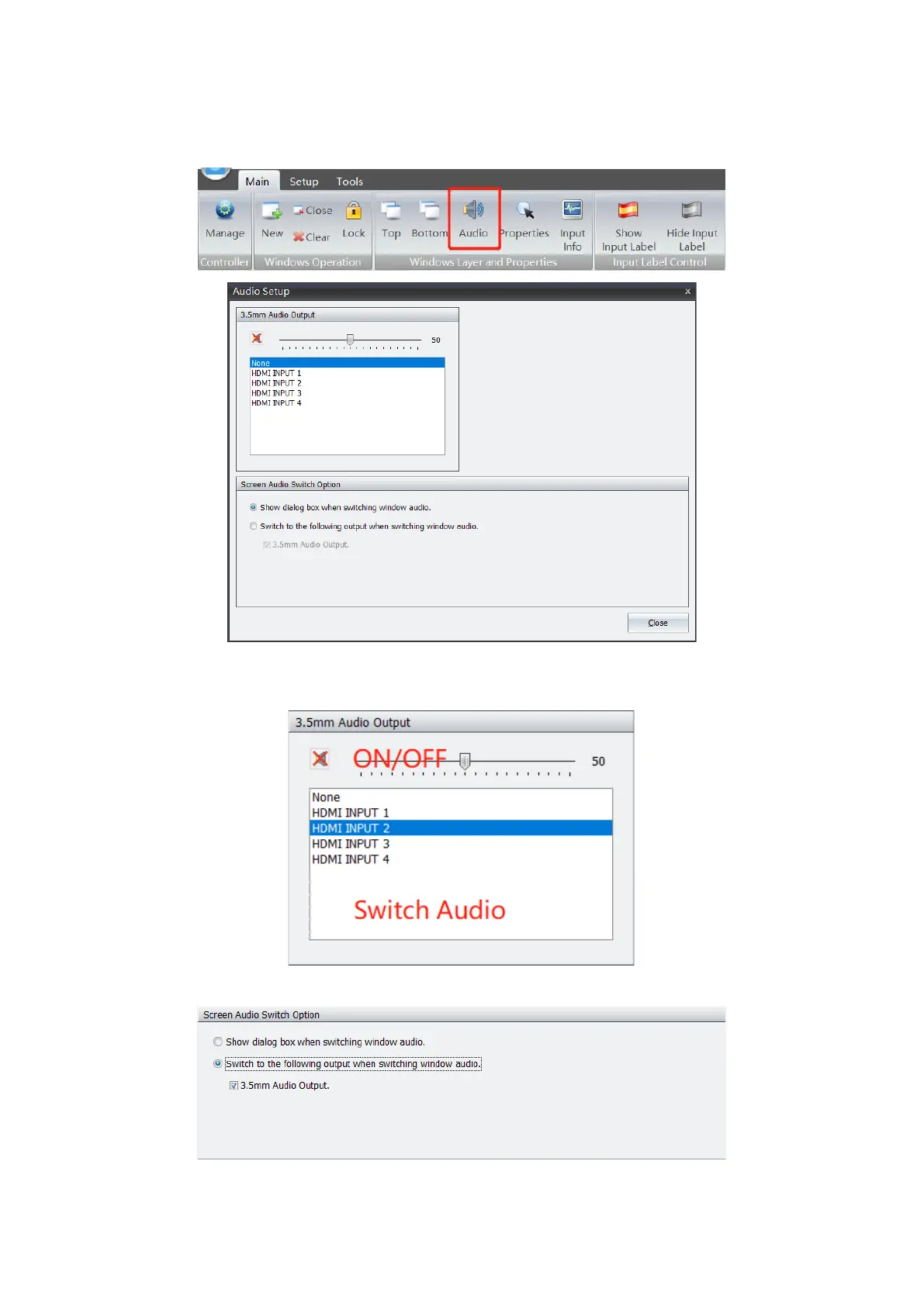 System supports turn on/off audio, volume adjustment and audio output model setting.