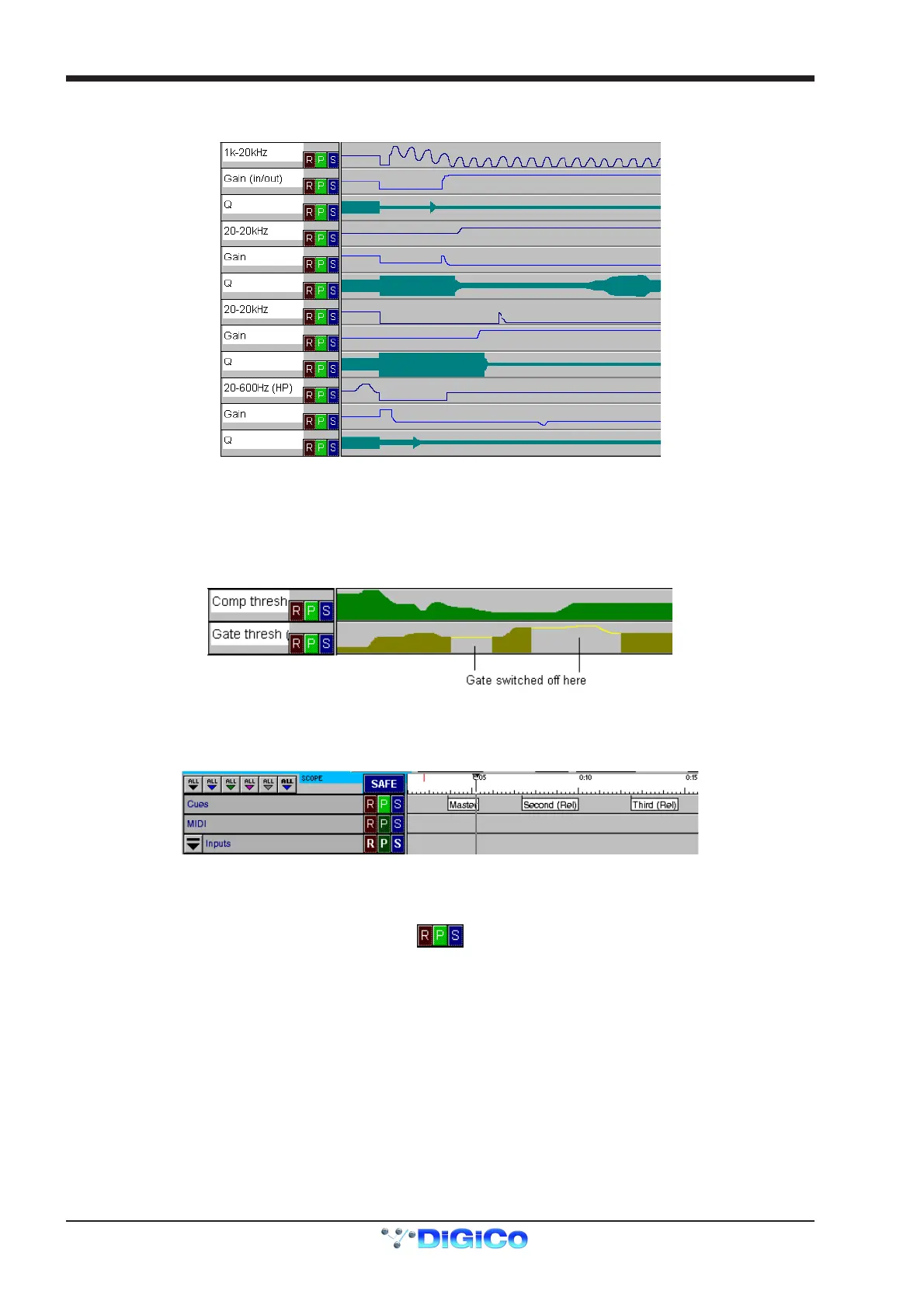 Each control, channel and section in the Event editor has a set of Record, Play and Safe buttons which light to show their status.
