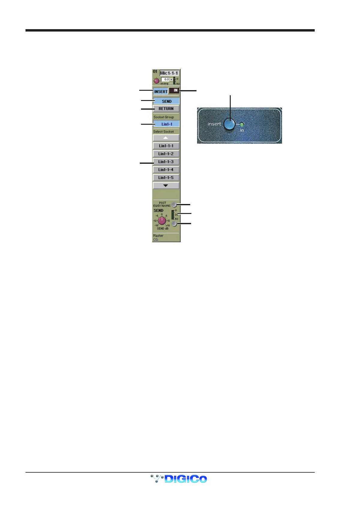 The Insert can be PRE or POST EQ and Dynamics switched by the button just above the Send Gain.