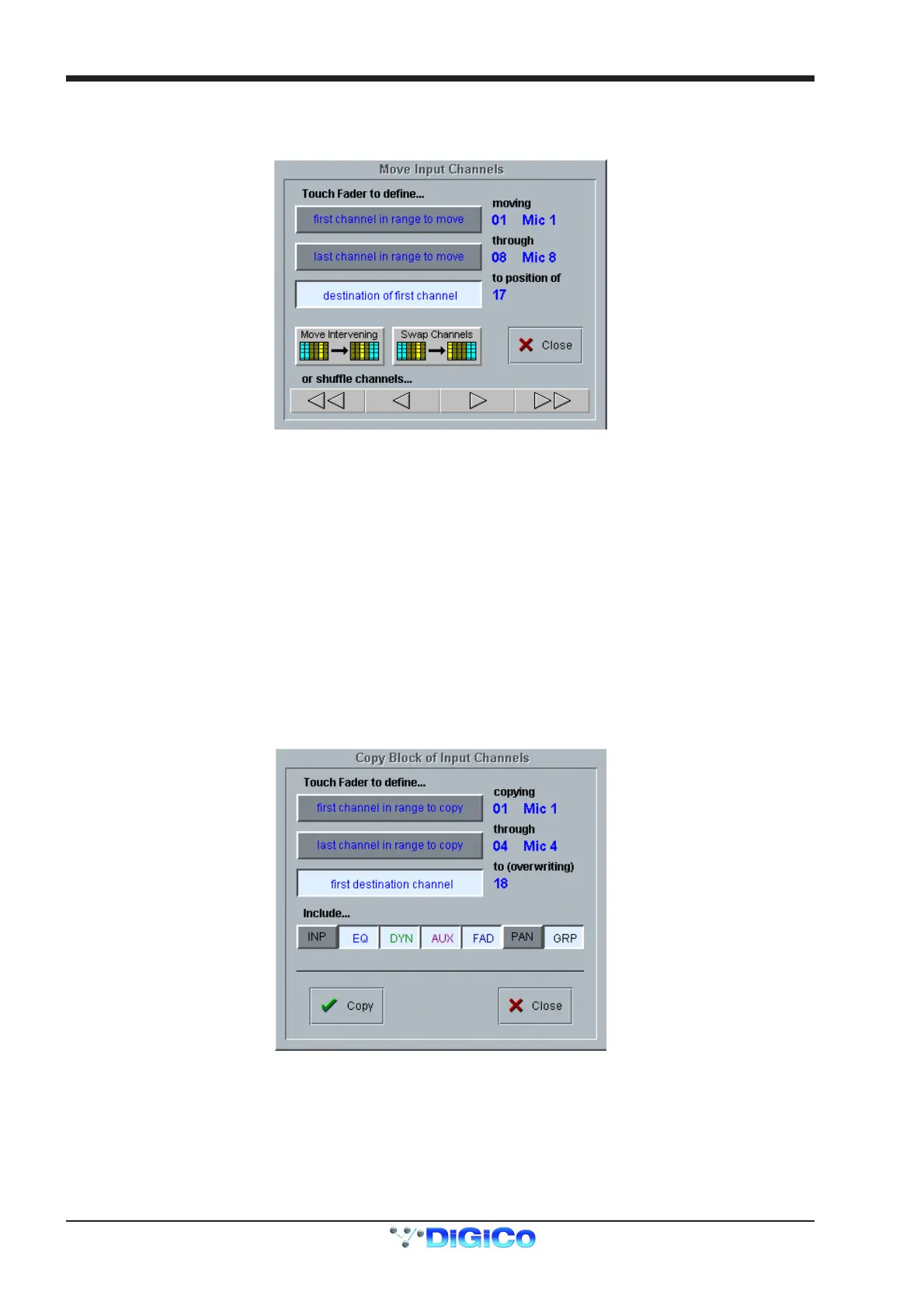 Touching the Move Channels button in the Layout menu opens the Move Input Channels panel which allows a single channel or a range