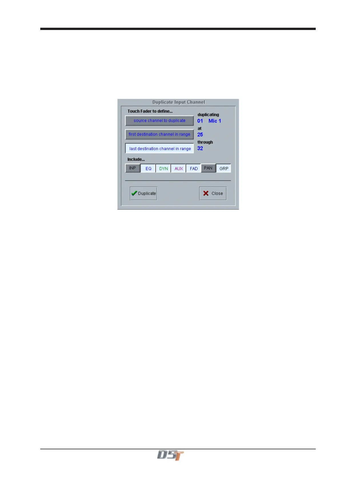 Touch a fader to define which channel will be duplicated and then touch two more channels to define the destination range. The source
