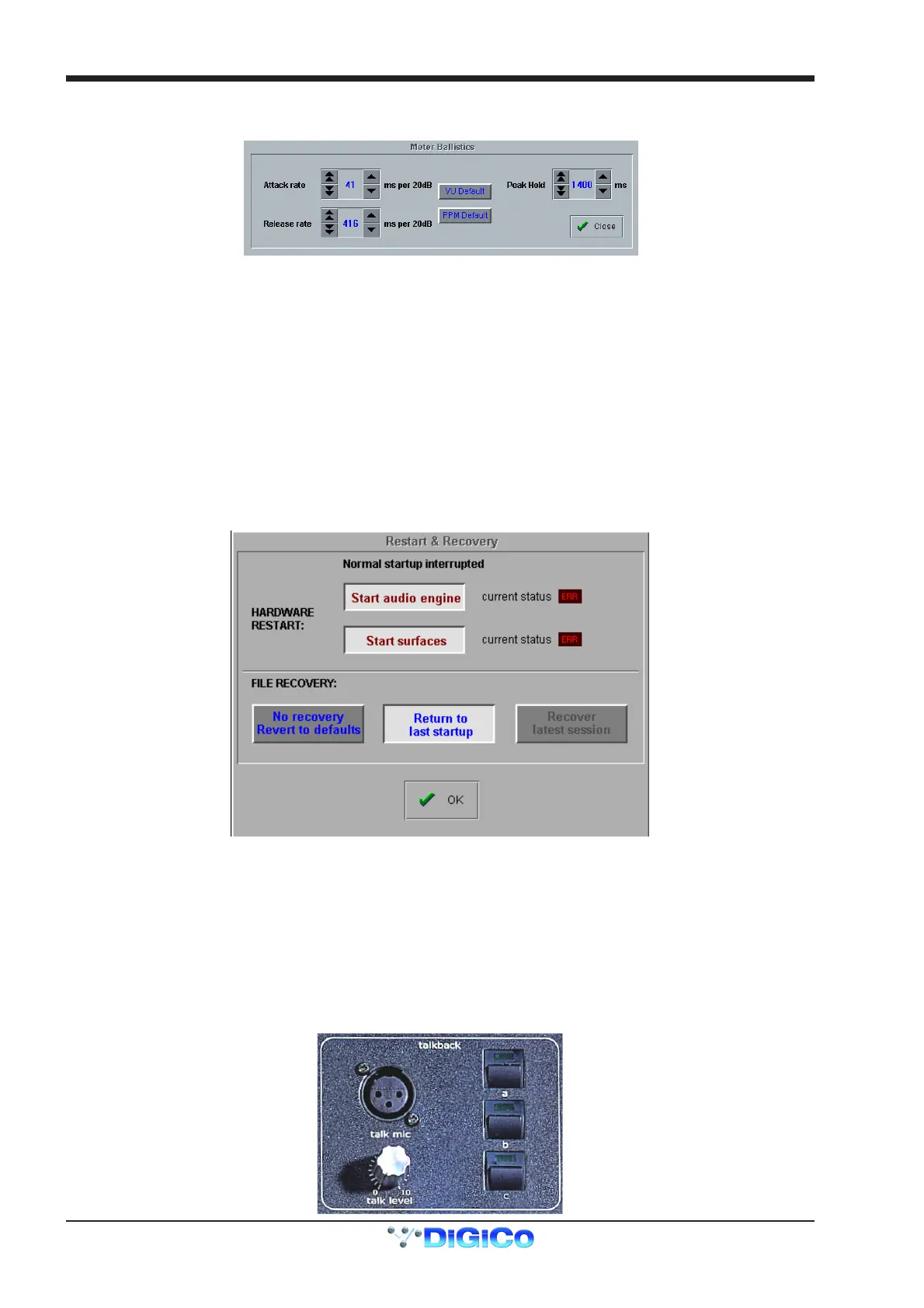 activated by buttons on the worksurface in conjunction with three Talback Feed Presets, labelled a,b and c. Both channels are controlled