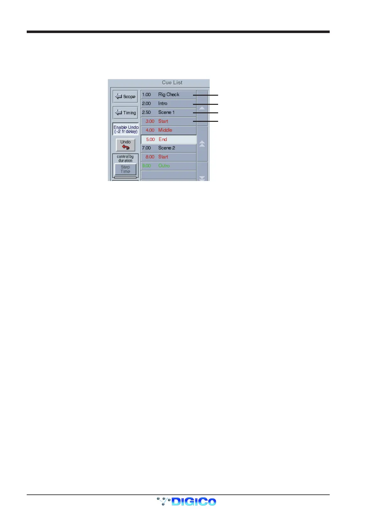 Alternatively, the buttons on the Worksurface on the right of the screen provide Scroll Up/Down buttons to change the assigned cue