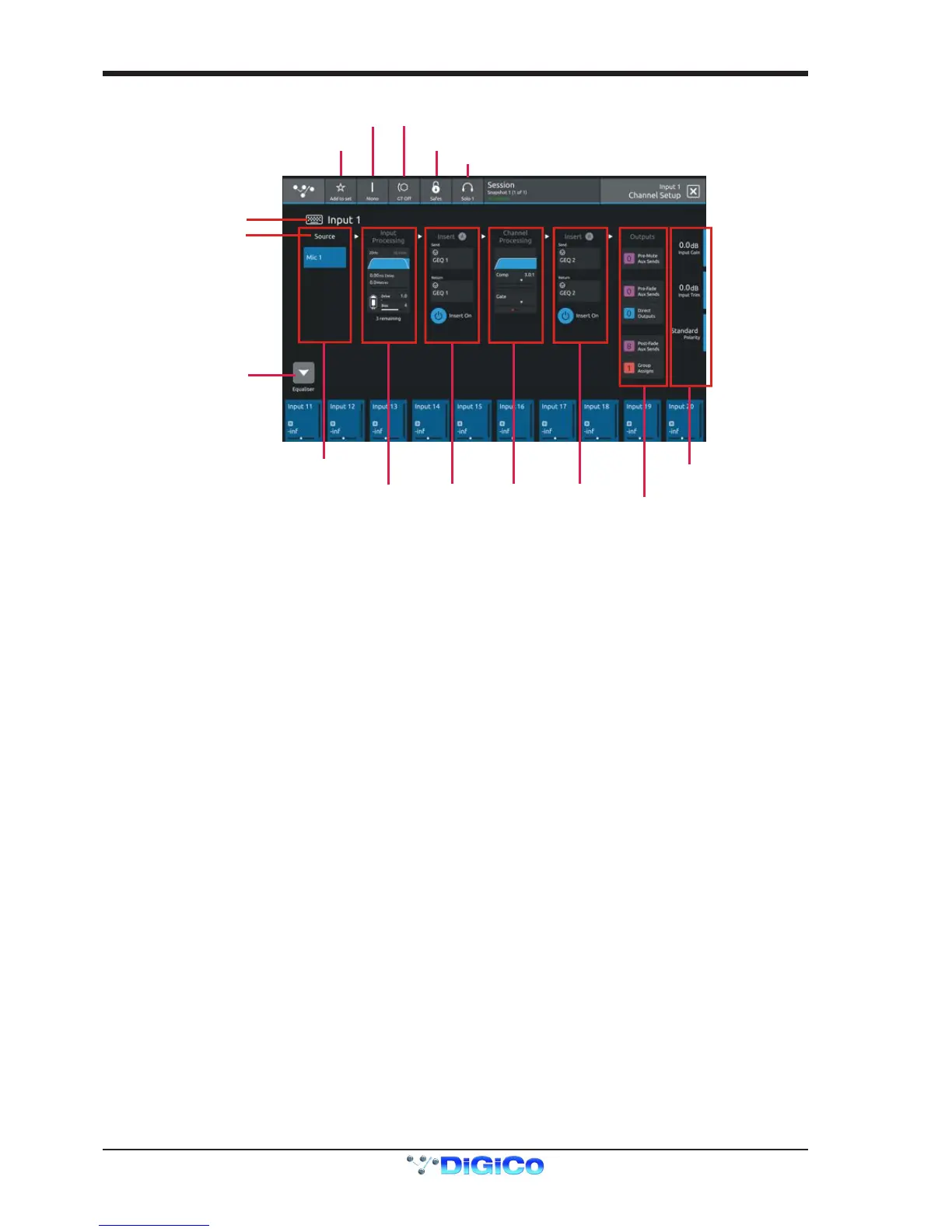 Each column represents a section of the channel processing strip and these columns can be selected by touching their title label.