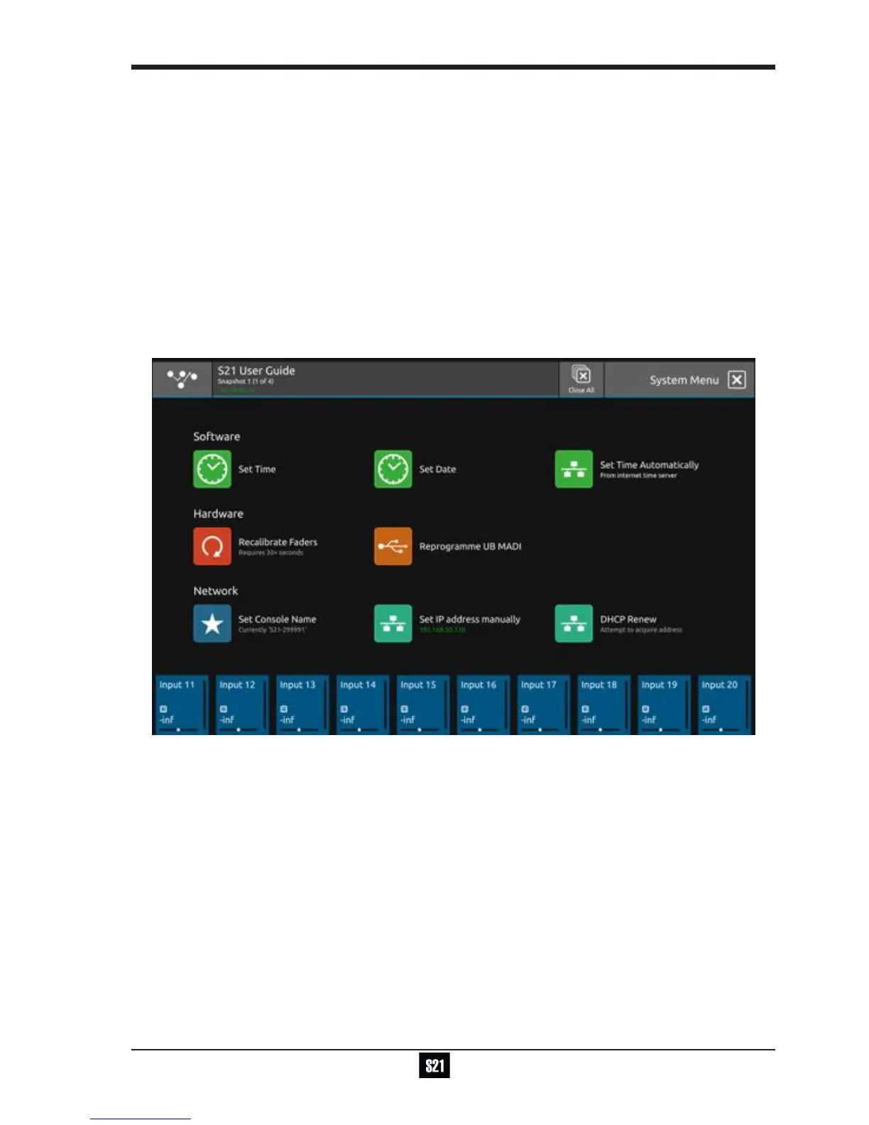 Touching the Main Menu > System button will display and allow the setting of various system level console functions.