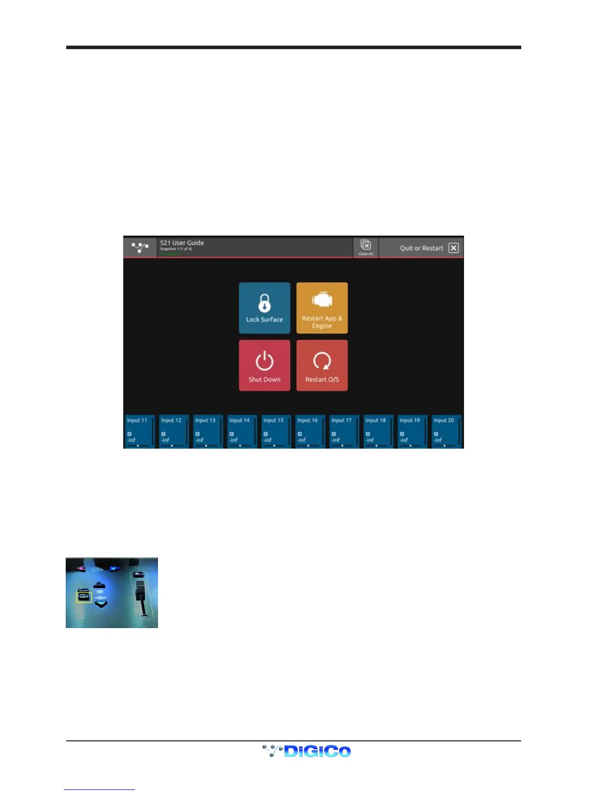 S21 Software can be upgraded by downloading a le as advised by support@digiconsoles.com, copying this to a USB key and proceed-