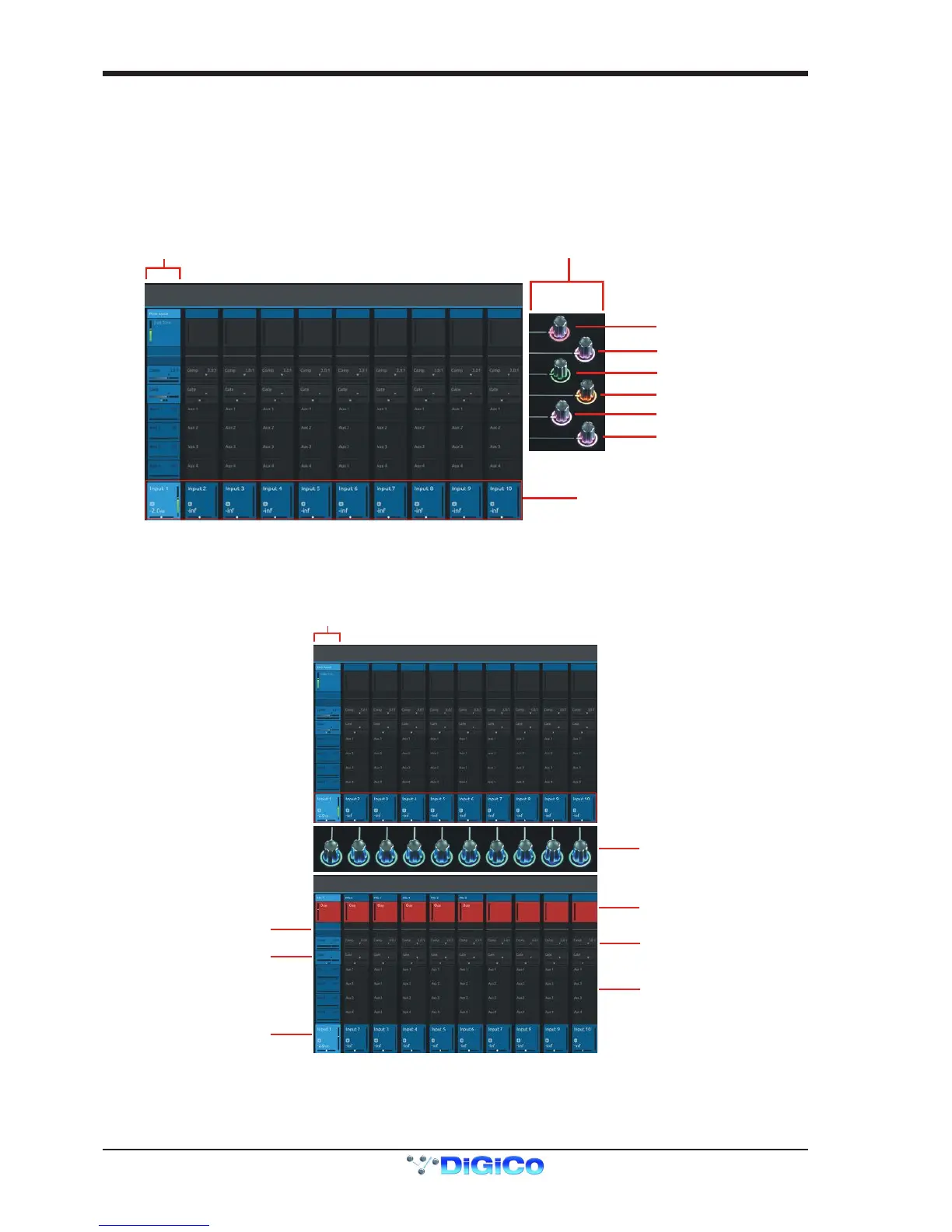 There is a row of 10 encoder/switches immediately below each touchscreen (shown above) that refer to the channels with which they