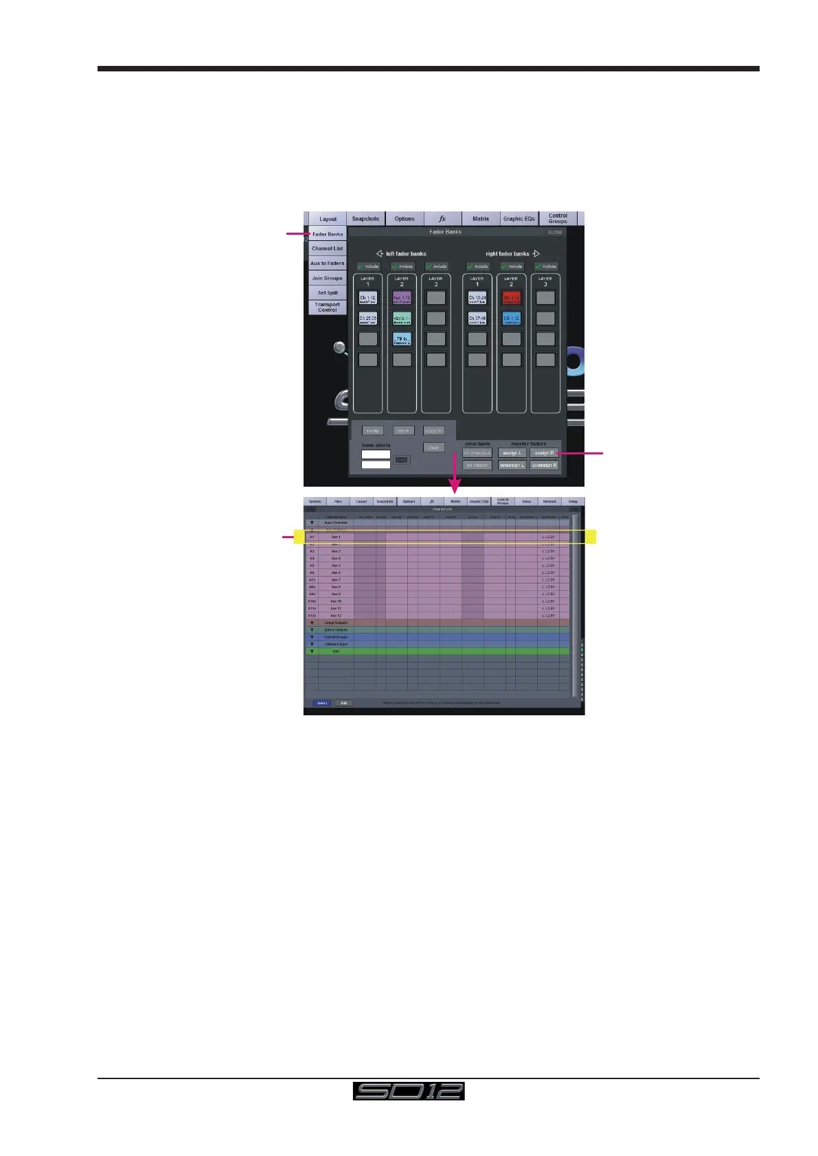 In addition, these faders can be reassigned to control any input channel or buss of your choice using the Layout>Fader Banks panel