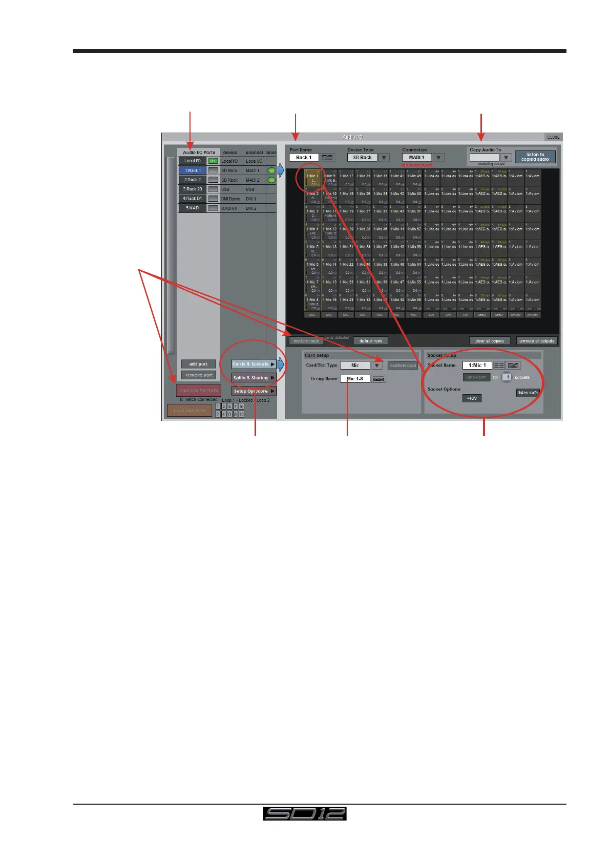 list and then select MADI from the Copy Audio To drop down menu. The 56 inputs on Rack 1 will be copied to the SD12 MADI output.
