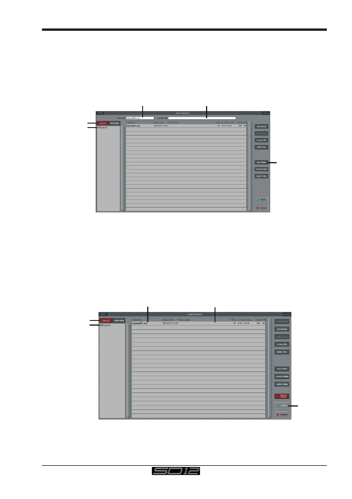 Note: If you touch a session name on the existing list, this name will automacally be selected as the new le name and touch-