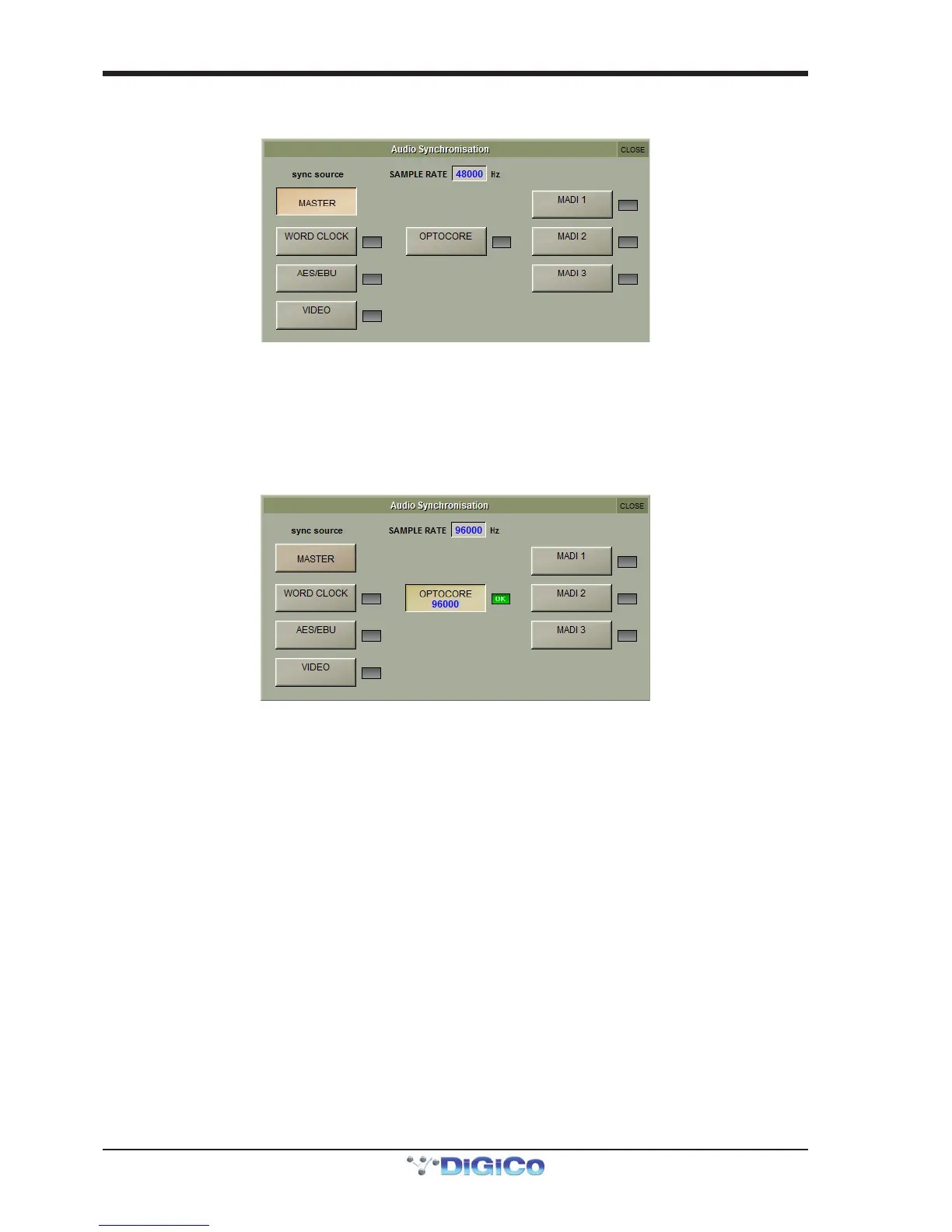 Note : When a valid clock is detected on an external sync input, the corresponding Green OK box will light,