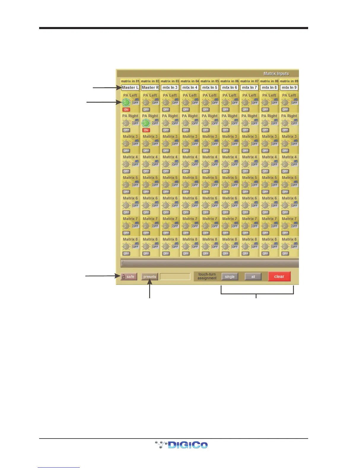 To open the Matrix Inputs panel, touch the Matrix button on the Master Screen. The window that opens allow you to route inputs