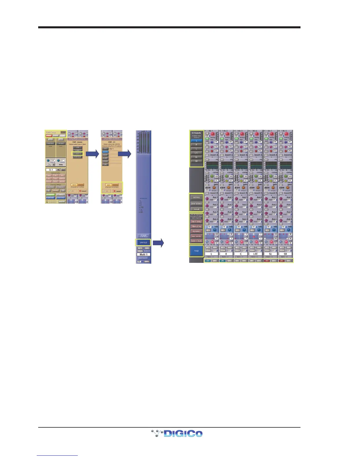 If the Unfold button in the Multi or in a multi-channel buss channel strip is pressed, the component channels will be displayed, and