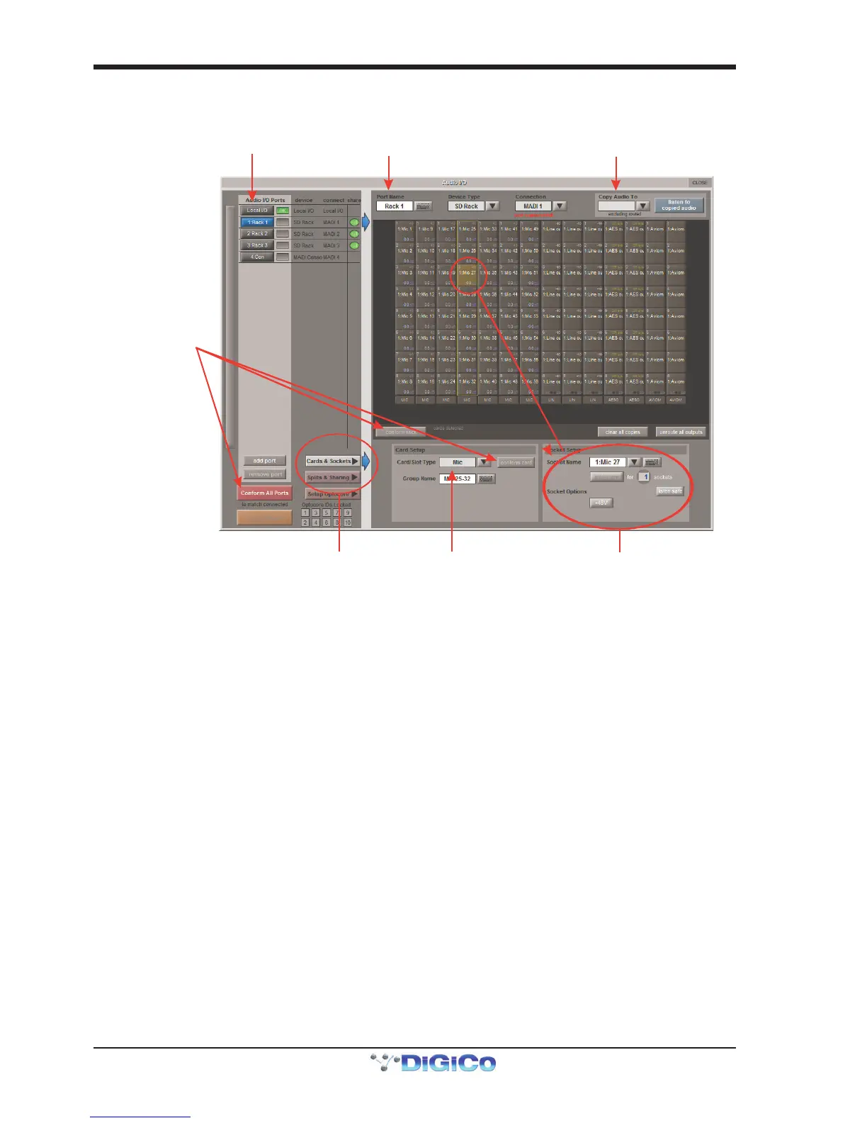 in the ports list and then select MADI from the Copy Audio To drop down menu. The 56 inputs on Rack 1 will be copied to the