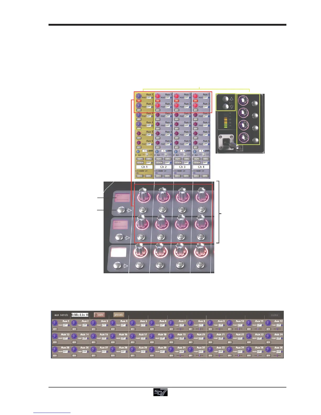 screen. This is done by assigning the required channel to the aux controls (the assigned auxes will be displayed in dark purple
