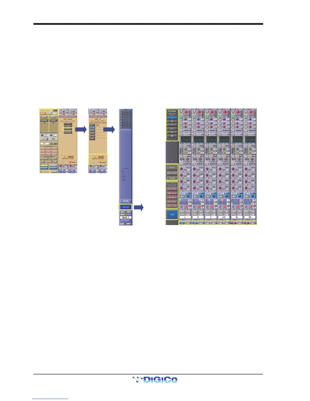 If the Unfold button in the Multi or in a multi-channel buss channel strip is pressed, the component channels will be displayed, and