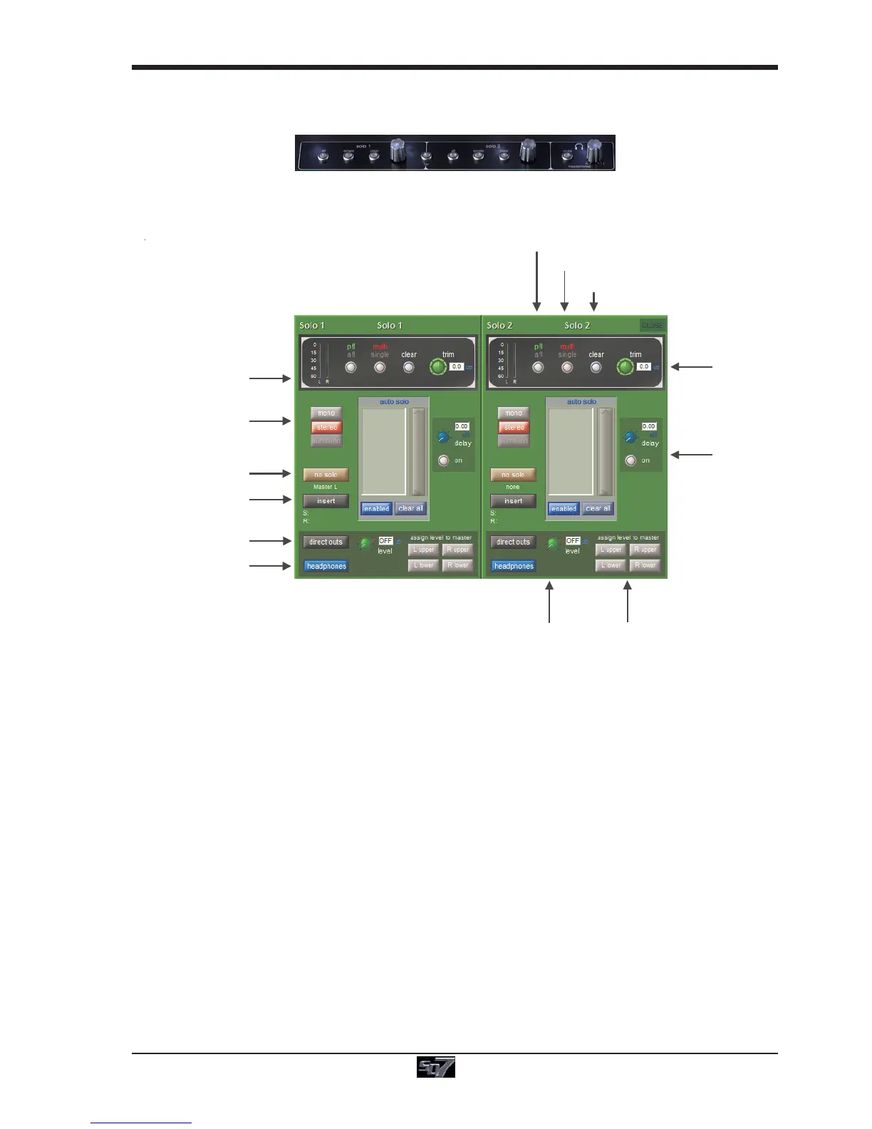 The SD7 Solo panel is accessed from a button at the top of the Master Screen. Some of the controls on this panel are duplicated