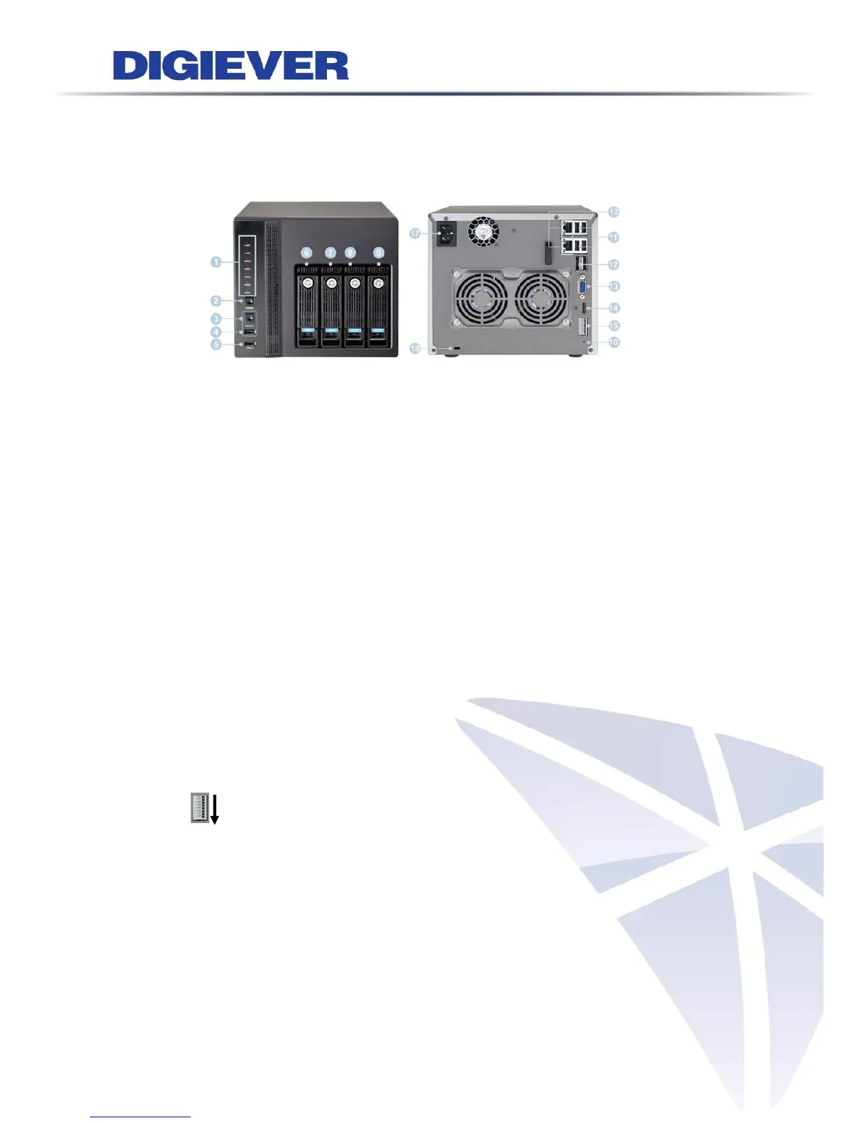 1. LED indicators: LAN1, LAN2, eSATA, HDD1, HDD2, HDD3, HDD4