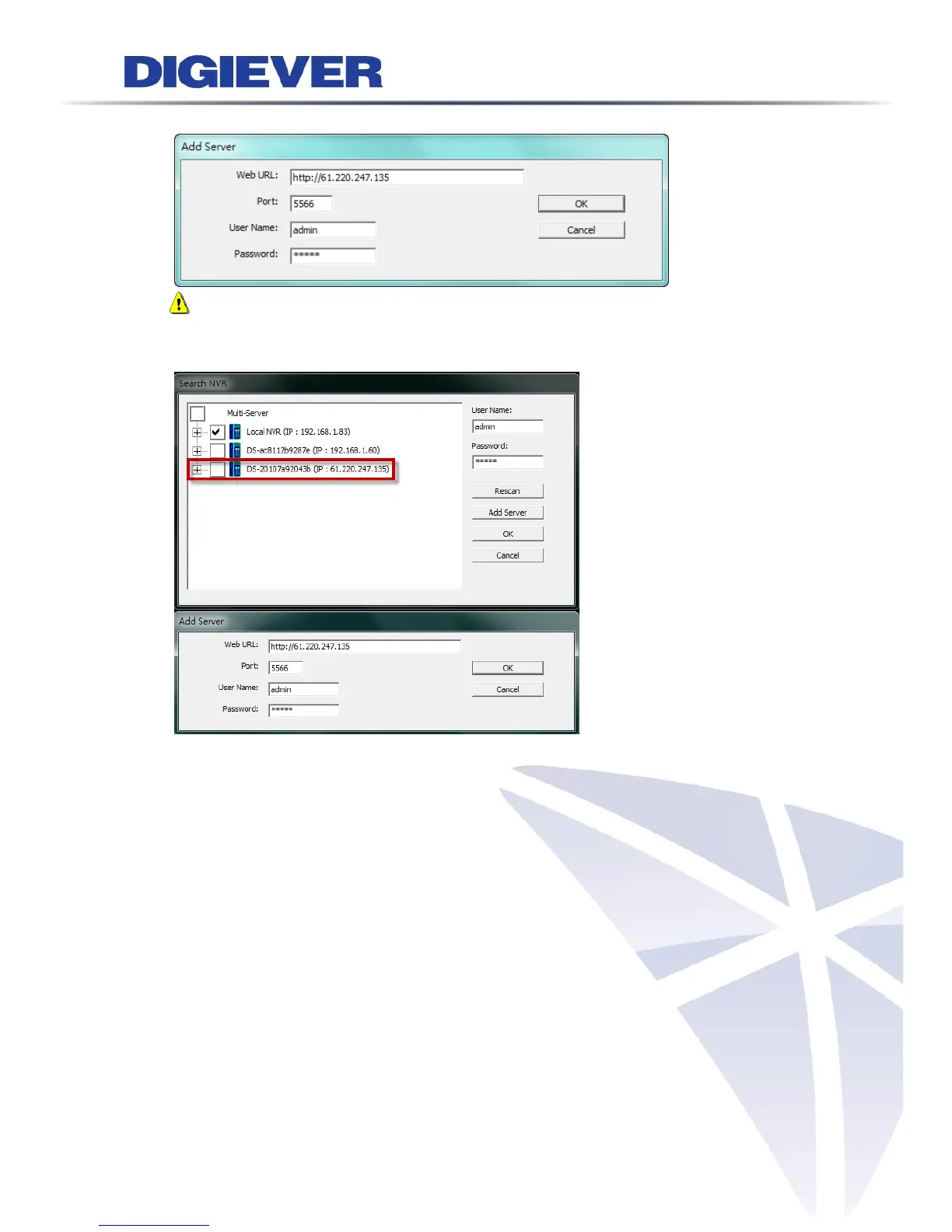 Please enter IP address, port, username and password, then click “OK” to apply.