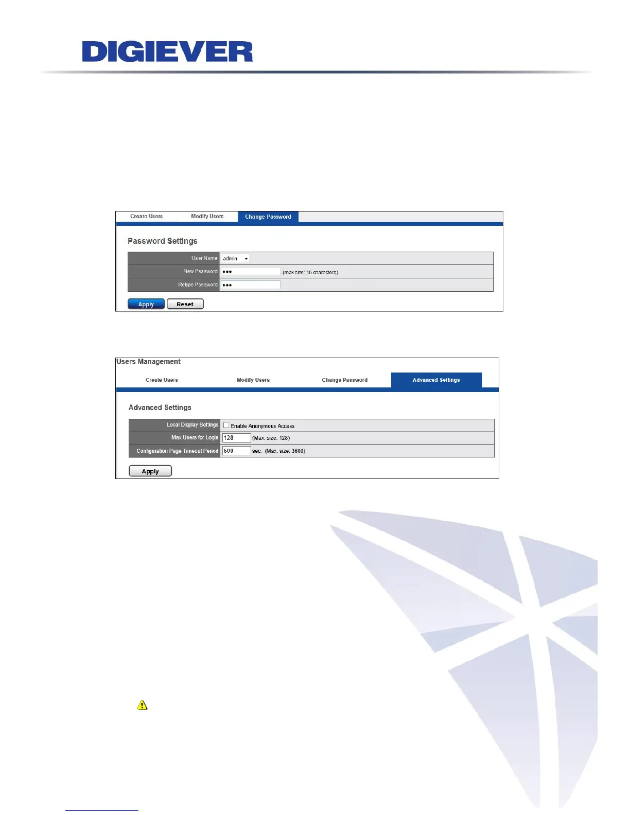 Select an account from “User Name” drop-down list to change password. Enter a