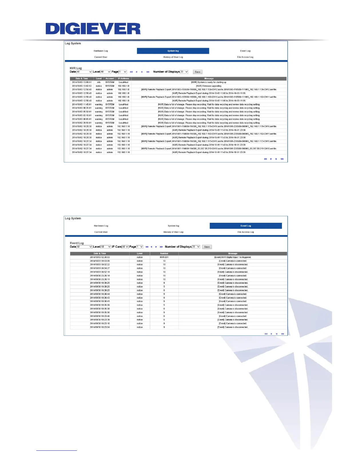 The log information in Current User shows the current users logged in the NVR with