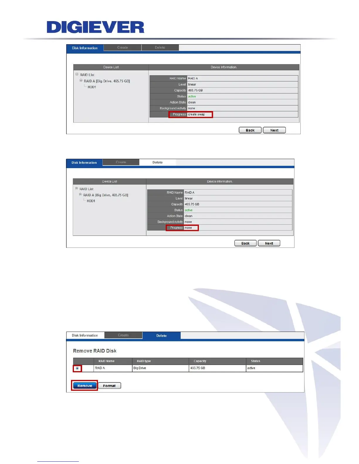 In “Delete” option, user can remove or format RAID disk by selecting the RAID disk.