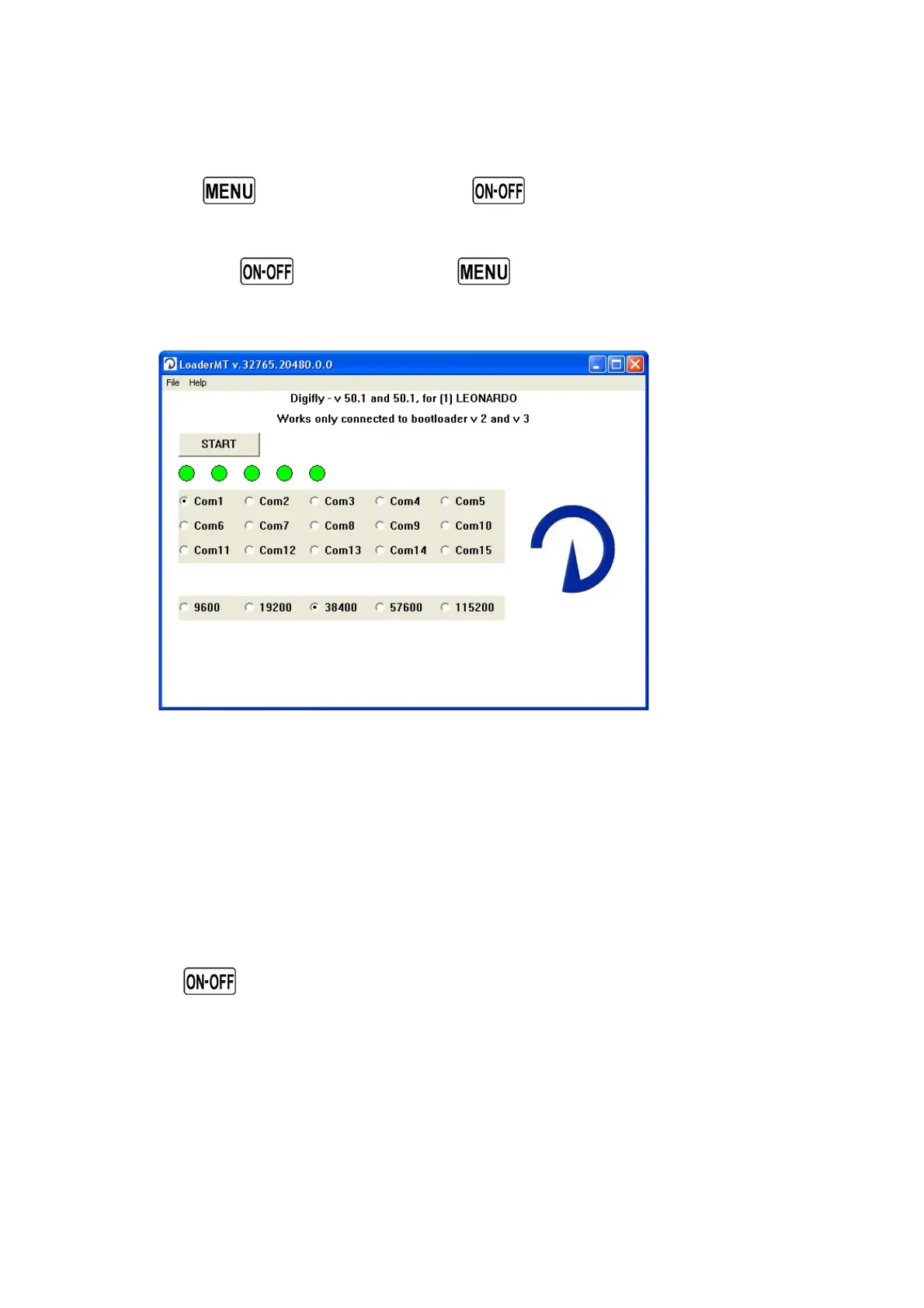 When the “Upgrade_xx_x_Leonardo.exe” tools software is operating you will see a the