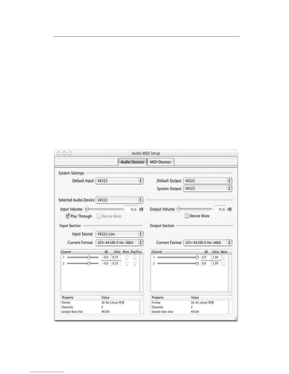 Use the Audio Midi setup panel to set the following parameters of your VX
