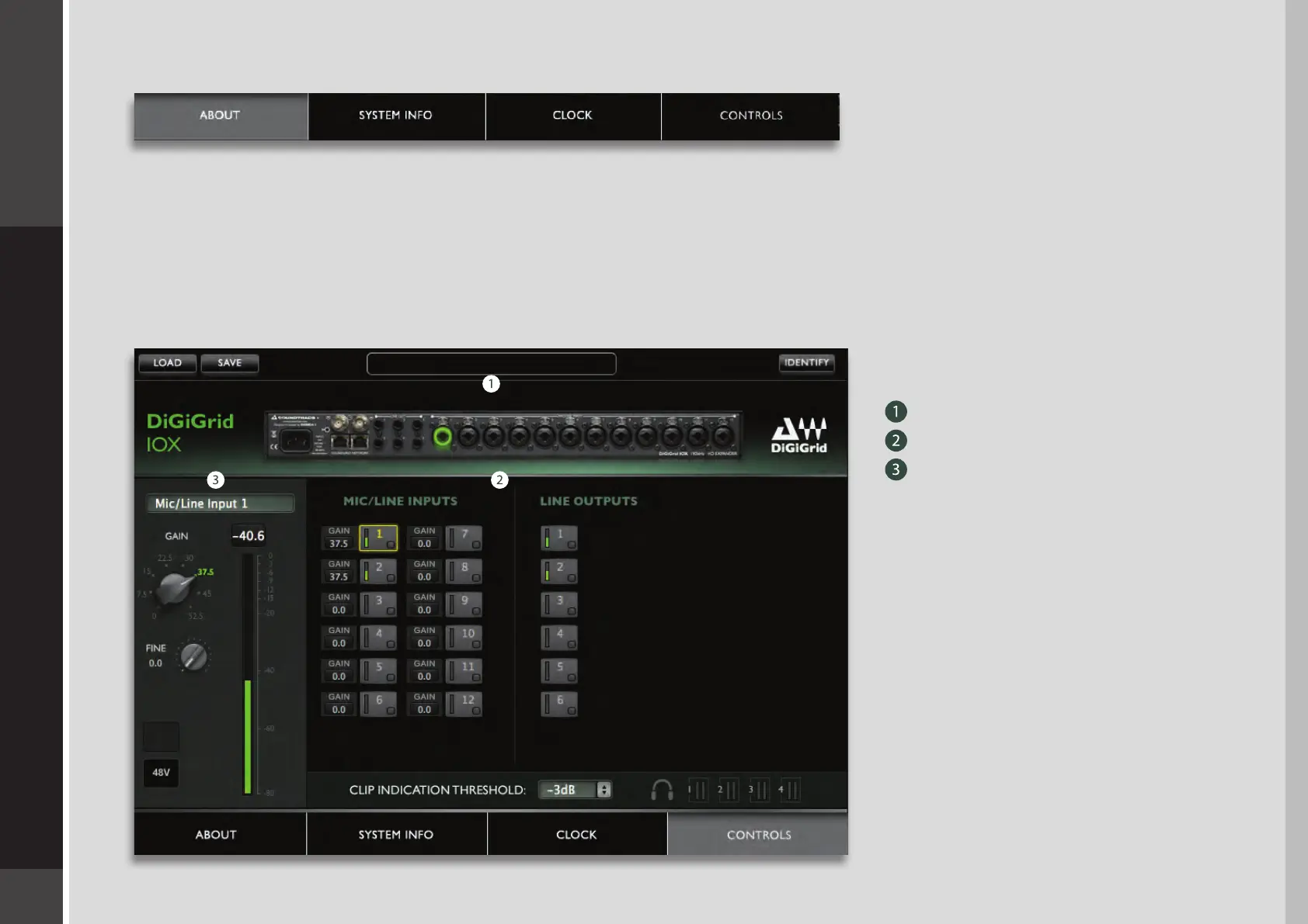 This is where you congure the inputs and outputs of the IOX. Mic preamps, line inputs and outputs, digital I/O, level control and