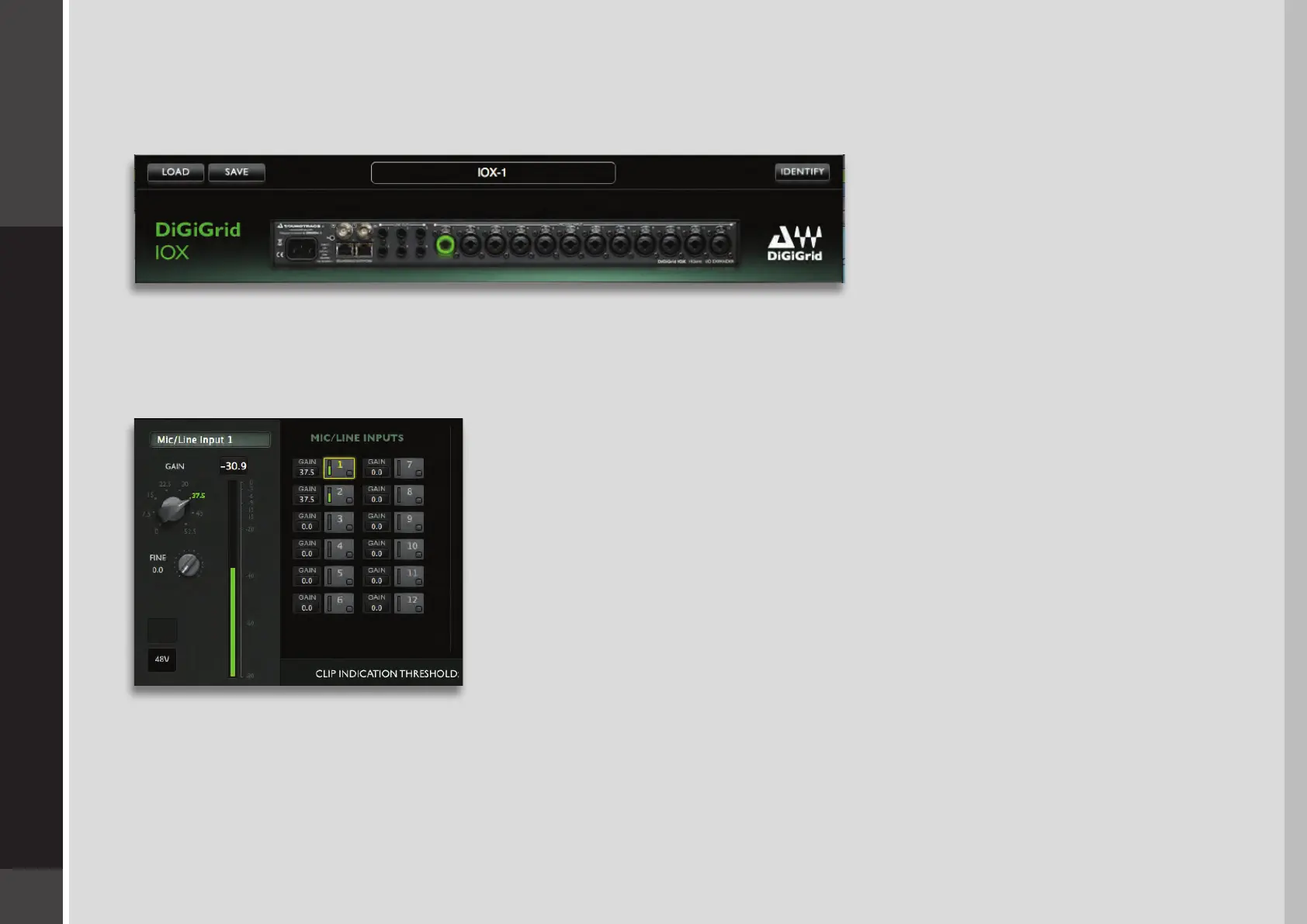 The Top Bar of the Controls page includes an illustration of the IOX rear panel. When an input or output is selected in the main