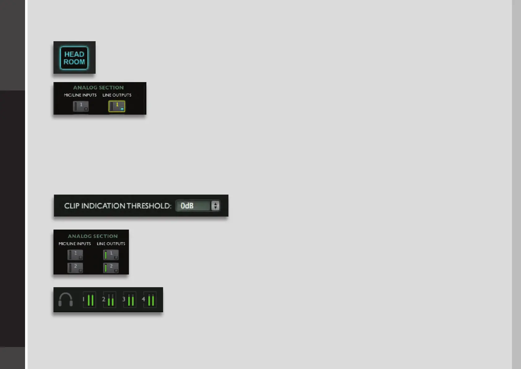 In addition to meters and clip and peak indicators—which are identical to the input controls—there is a Headroom