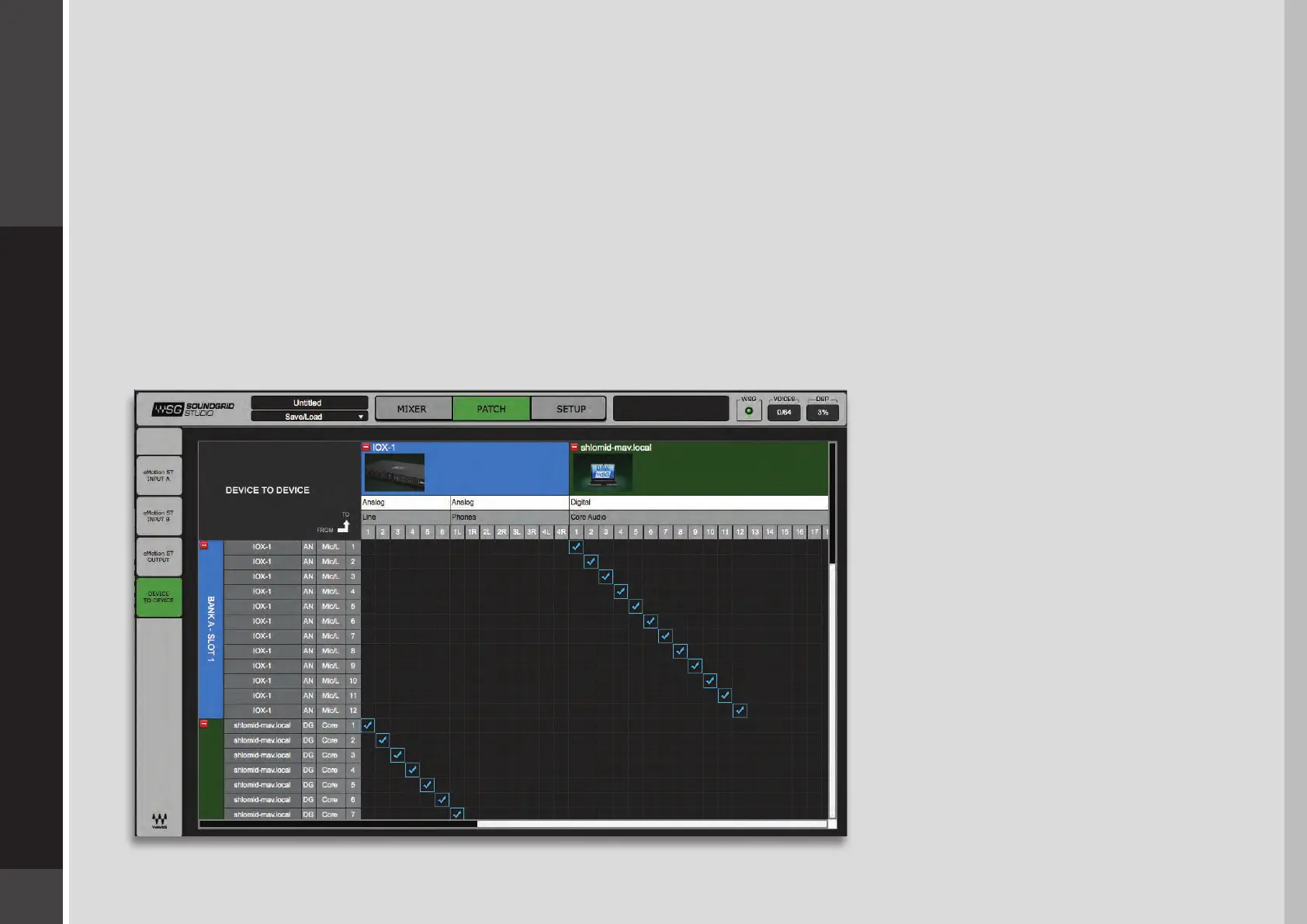 In the SoundGrid Studio Patch page, select the Device-to-Device tab. All device and driver channels are shown along both the