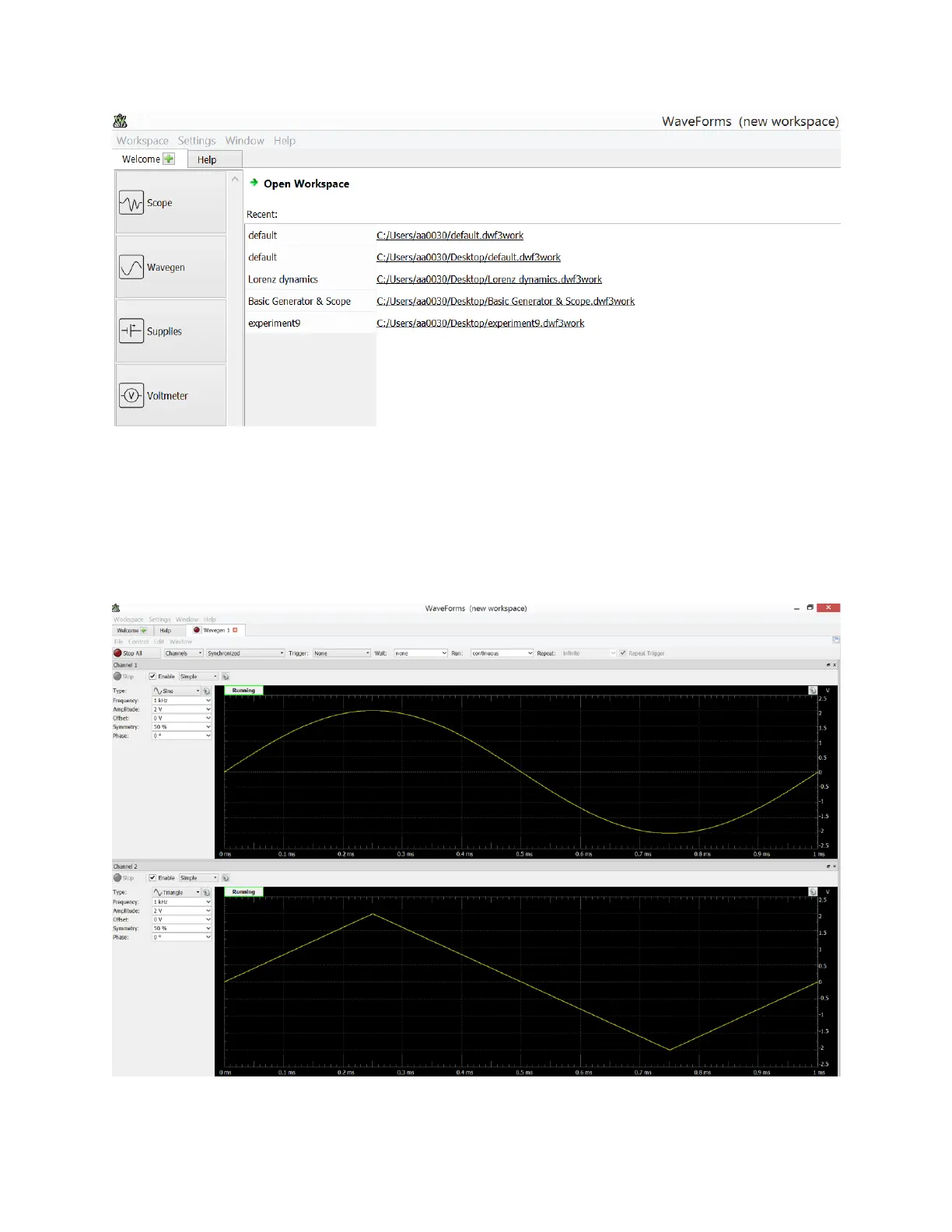 a 1KHz sine wave with 2 Volt amplitude, and Channel 2 generating a 1KHz triangular wave with