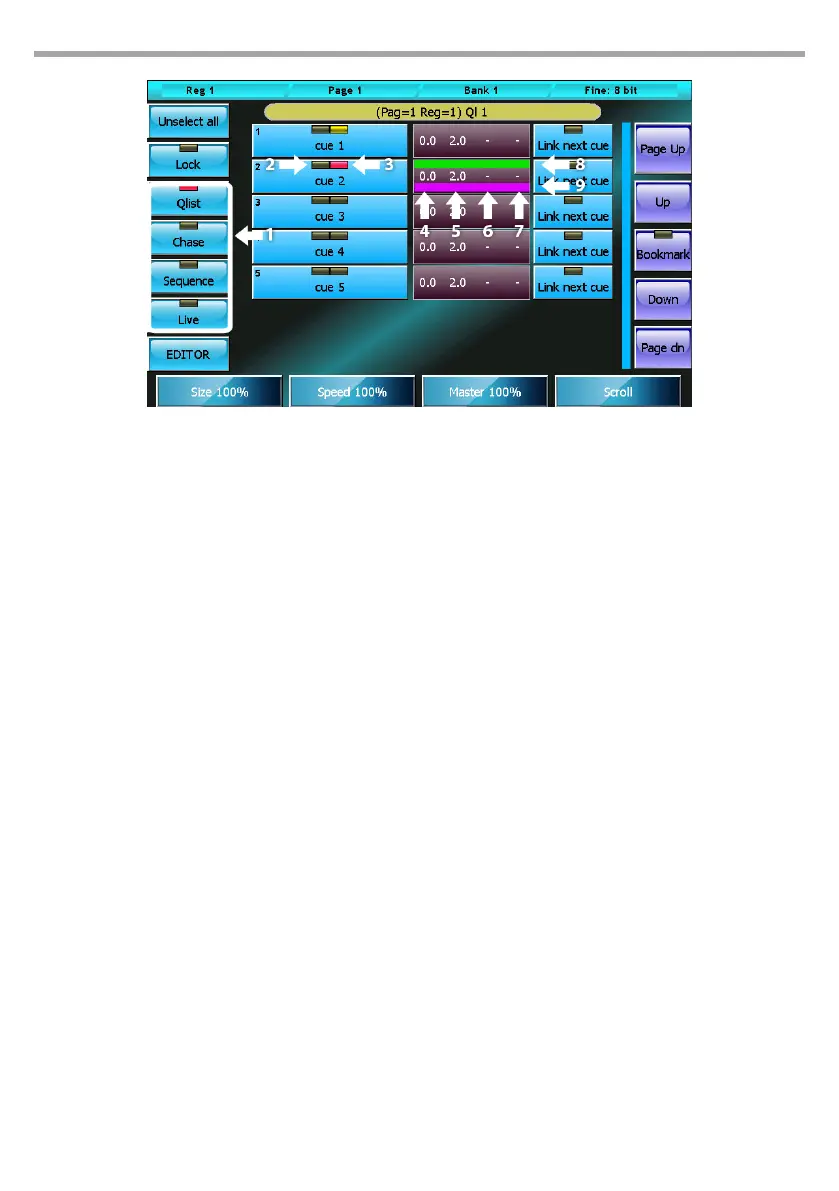 (Master Size) and the speed (master Speed) of the eects of the cue or the intensity of the dimmer (Master