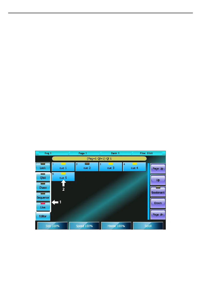 • Qlist, Chase, Sequence, Live: cue list mode selection buttons