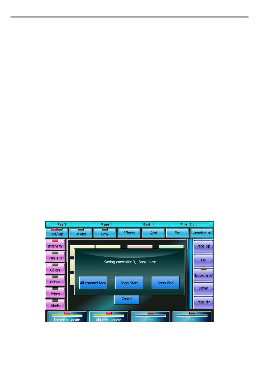 Cues can be saved in 3 dierent ways: All channel fade, Snap Start, or Snap end.