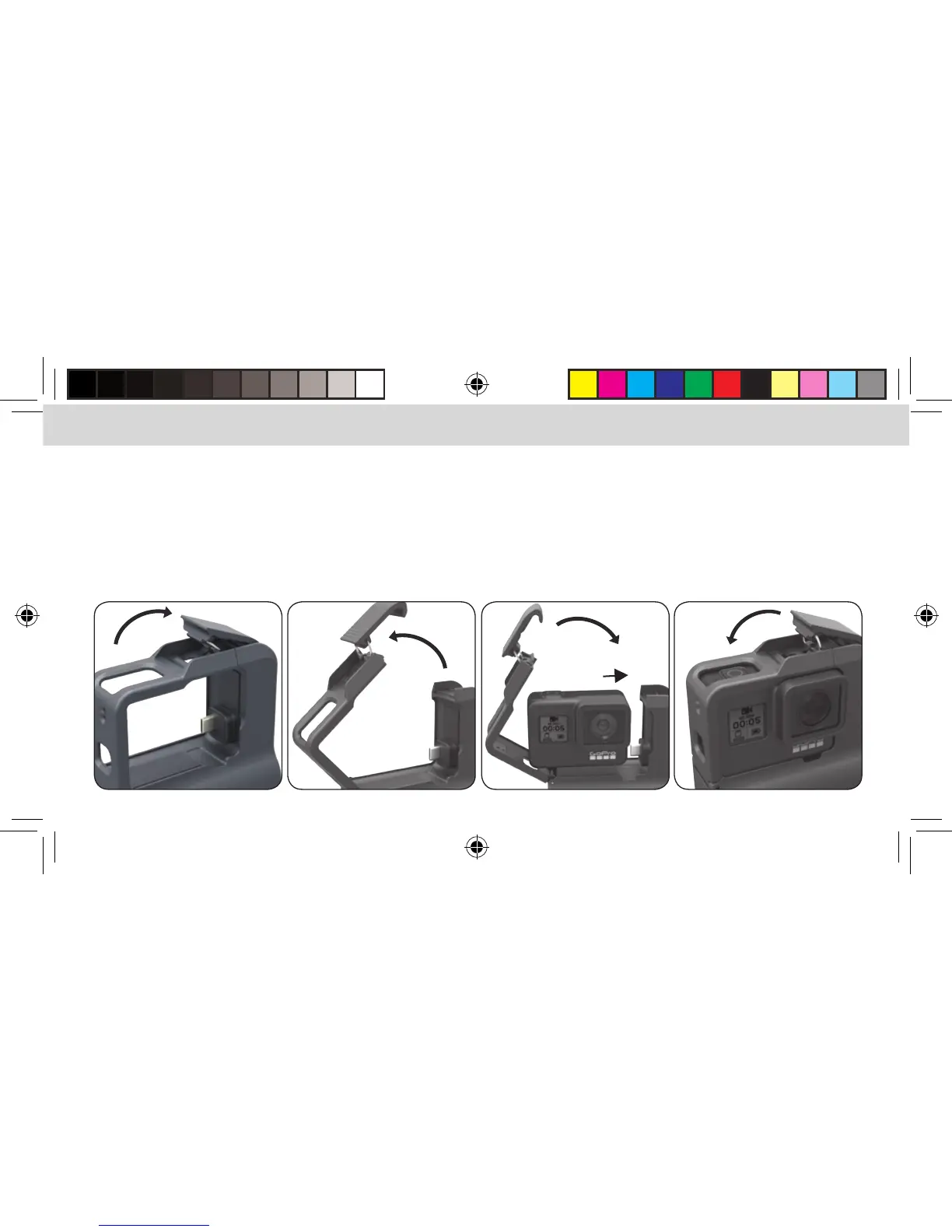 . Mueva el broche de seguridad y el marco pivotante hacia la izquierda para poder instalar la cámara GoPro.