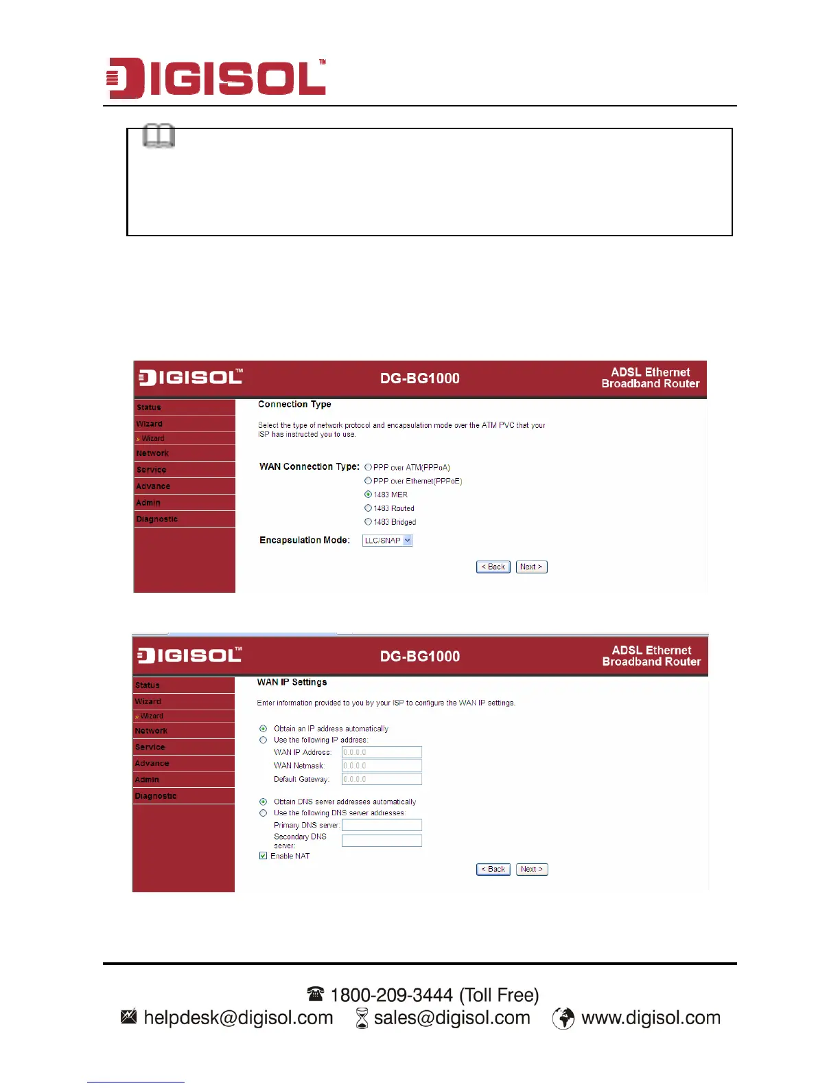 In the Connection Type page, set the WAN connection type to 1483 MER, the encapsulation