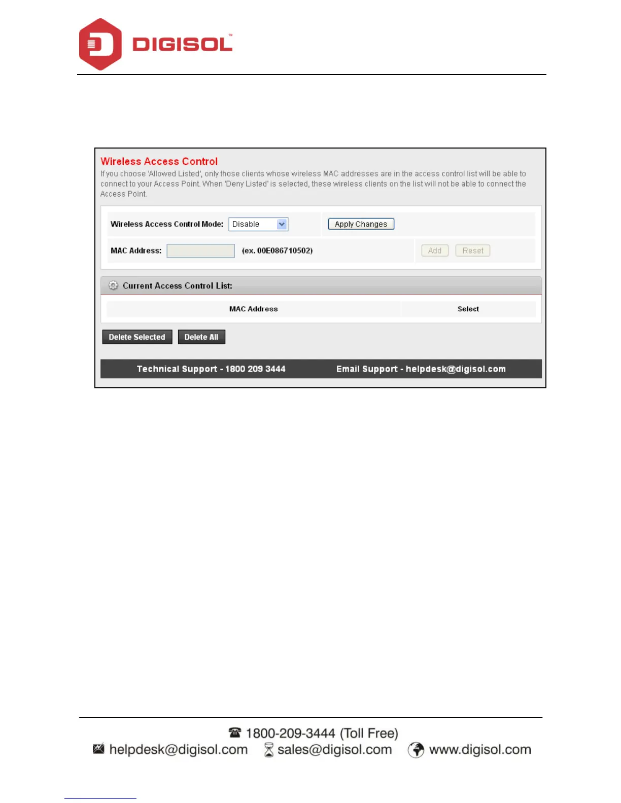 whose MAC addresses are listed in the Current Access Control List are denied to access the