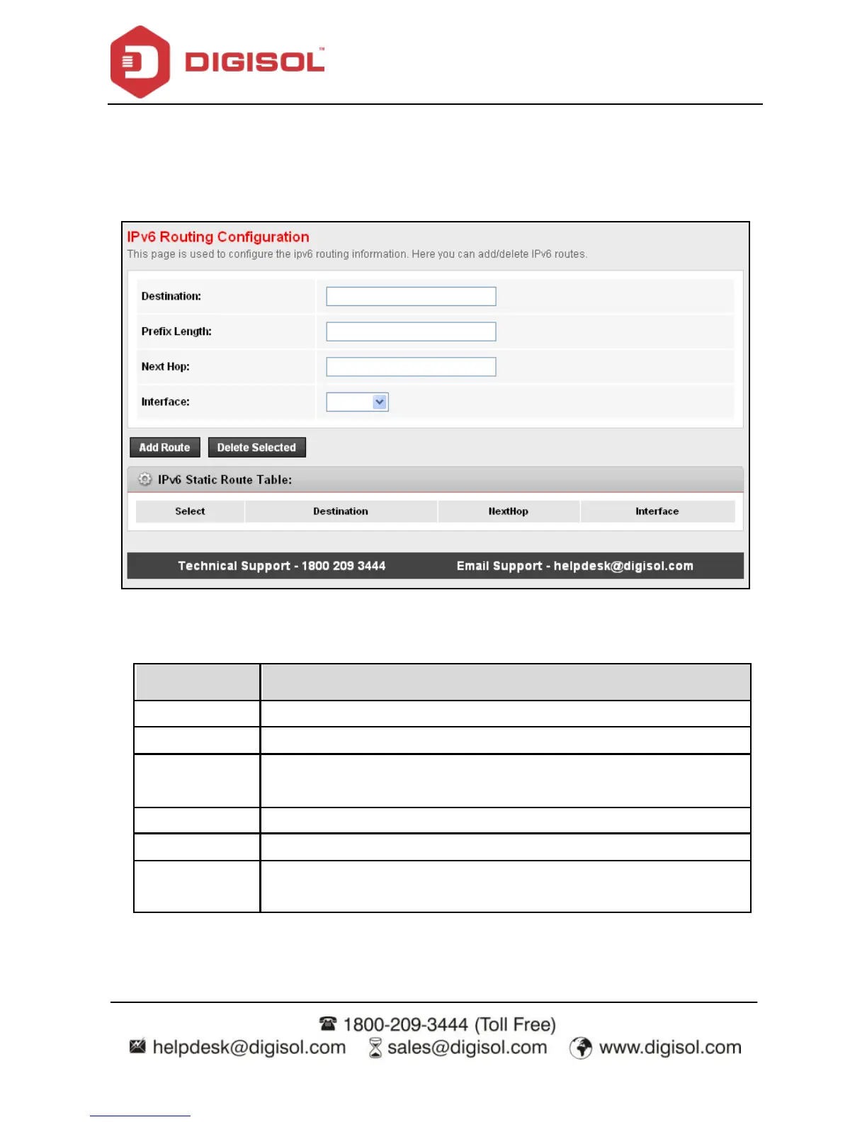 Select a row in the IPv 6 Static Route Table and click it to delete the
