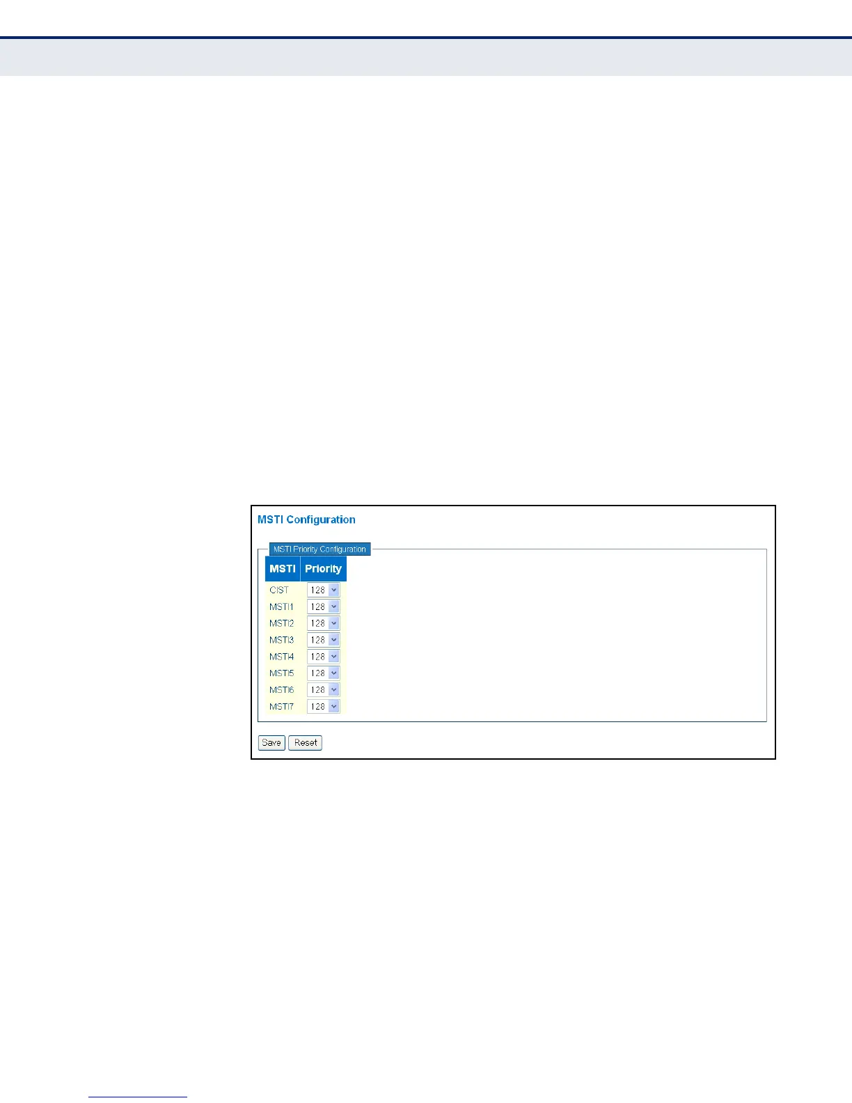 1. Click Configuration, Spanning Tree, MSTI Priorities.