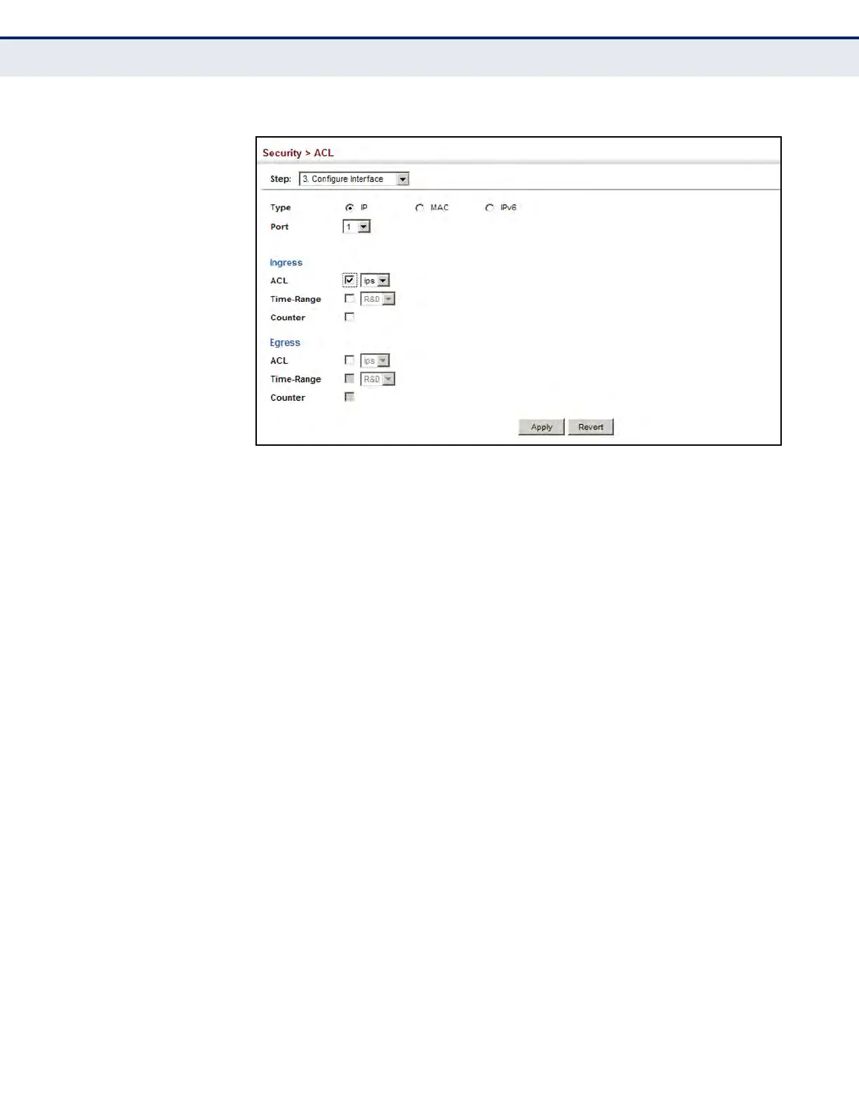 After configuring ACLs, use the Security > ACL > Configure Interface (Add