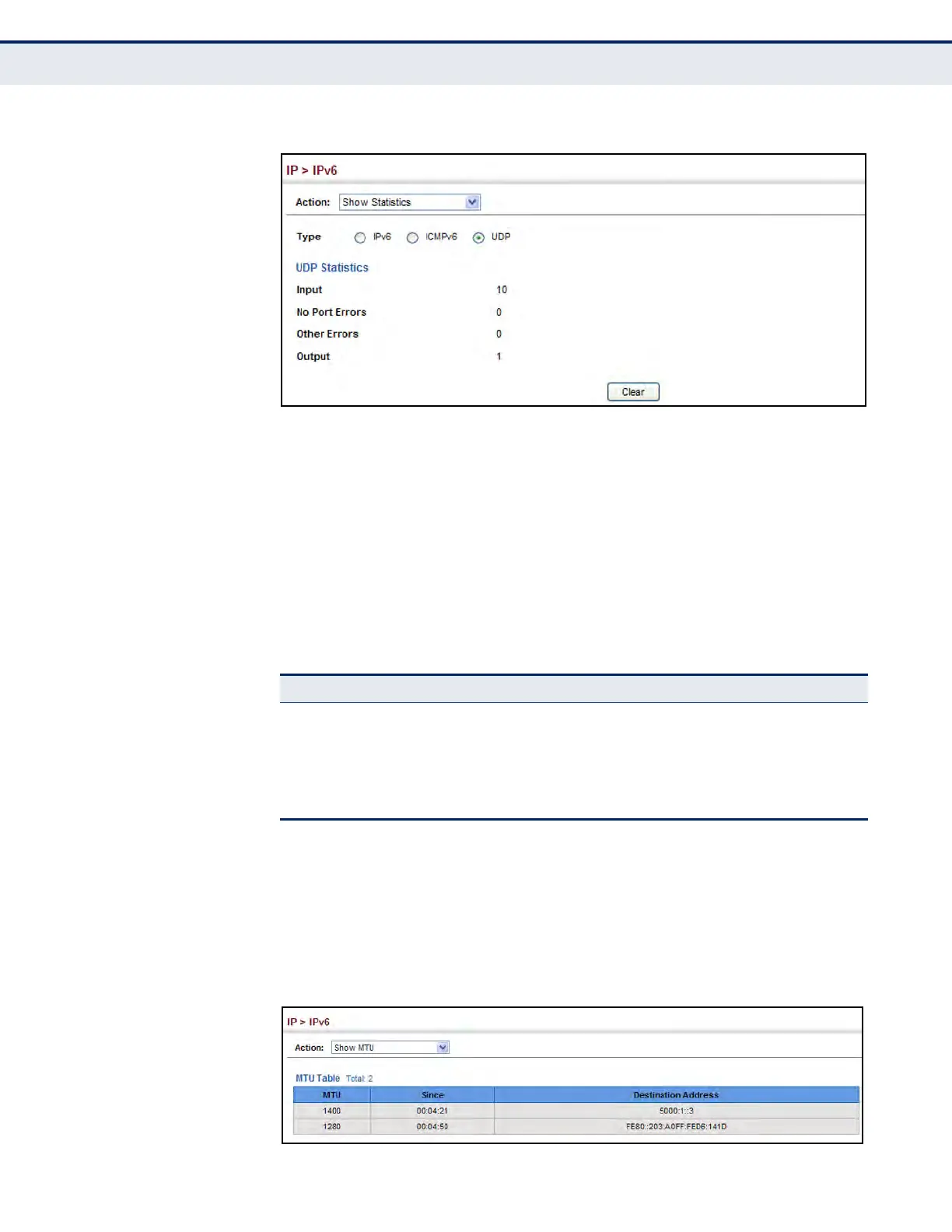 Use the IP > IPv6 Configuration (Show MTU) page to display the maximum