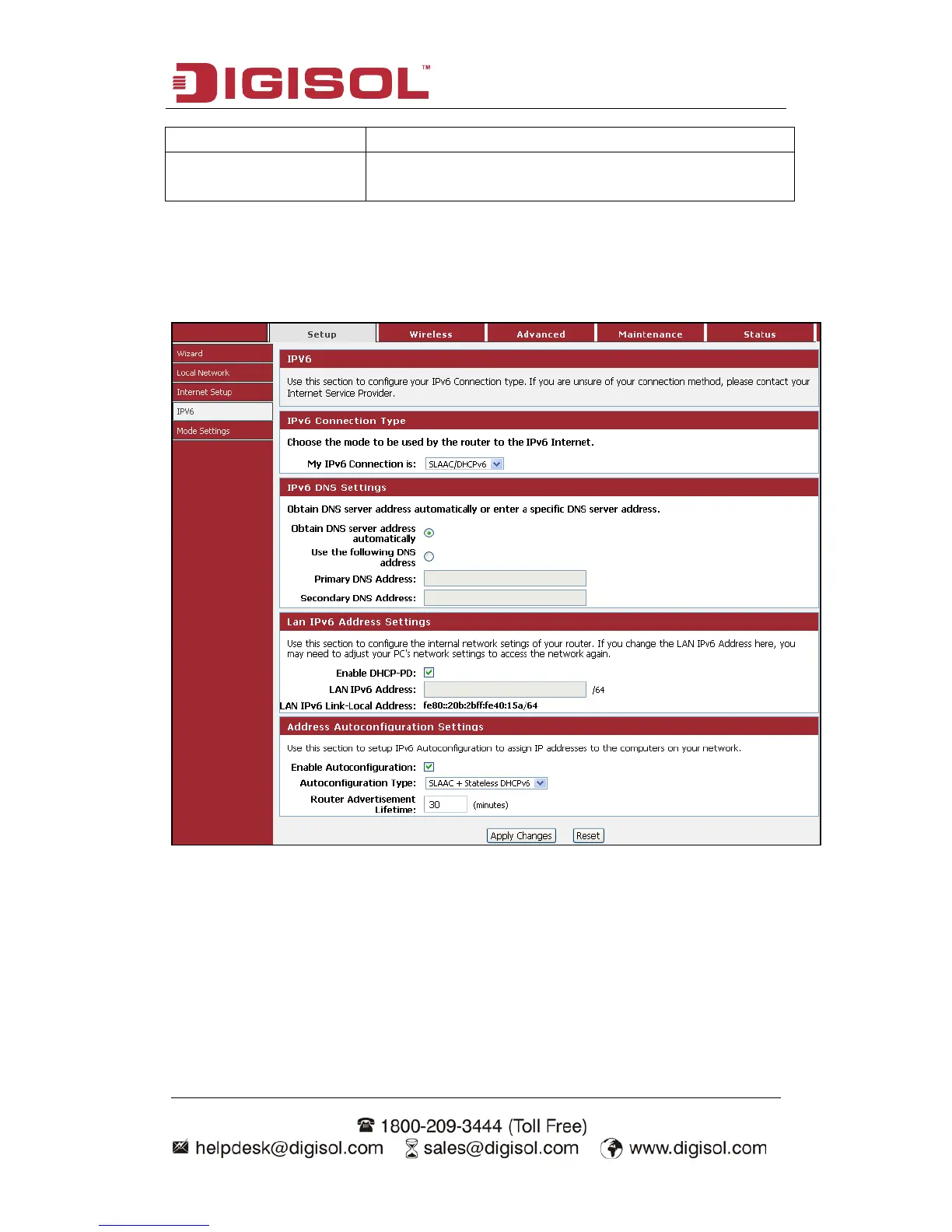 In this section we can set the WAN parameters as per DHCP IPv6.