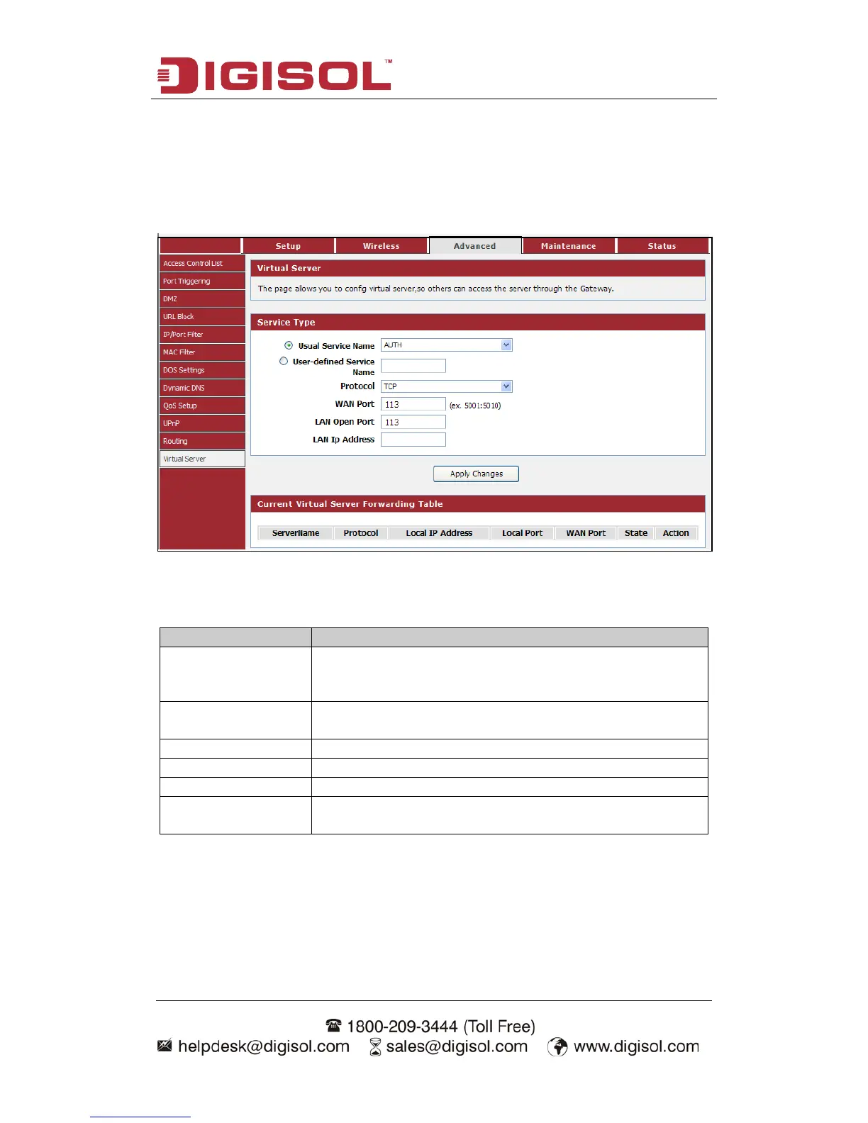 Choose menu “Advanced→Virtual Server”, below given screen will be displayed.
