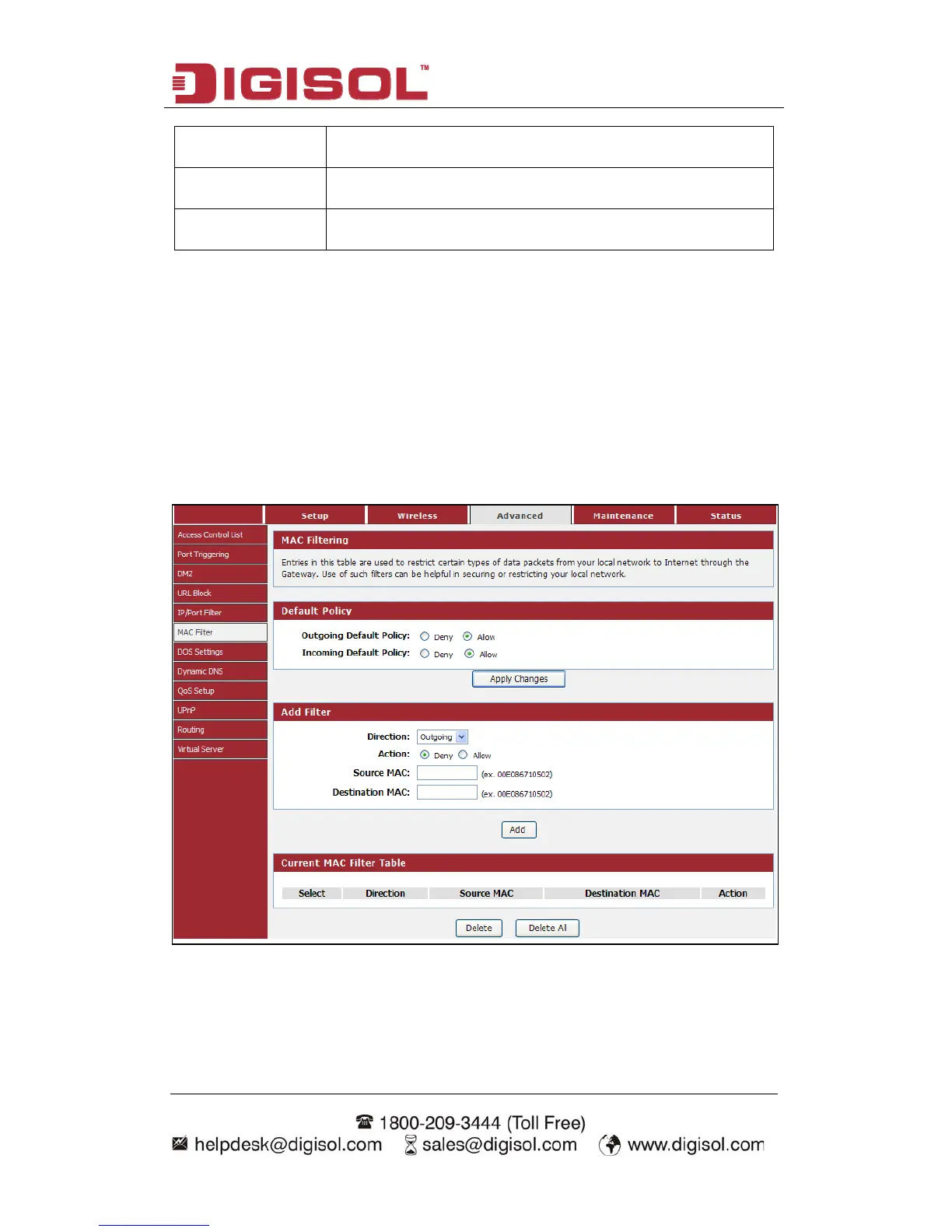 Choose menu “Advanced→MAC Filter”, below given screen will be displayed.