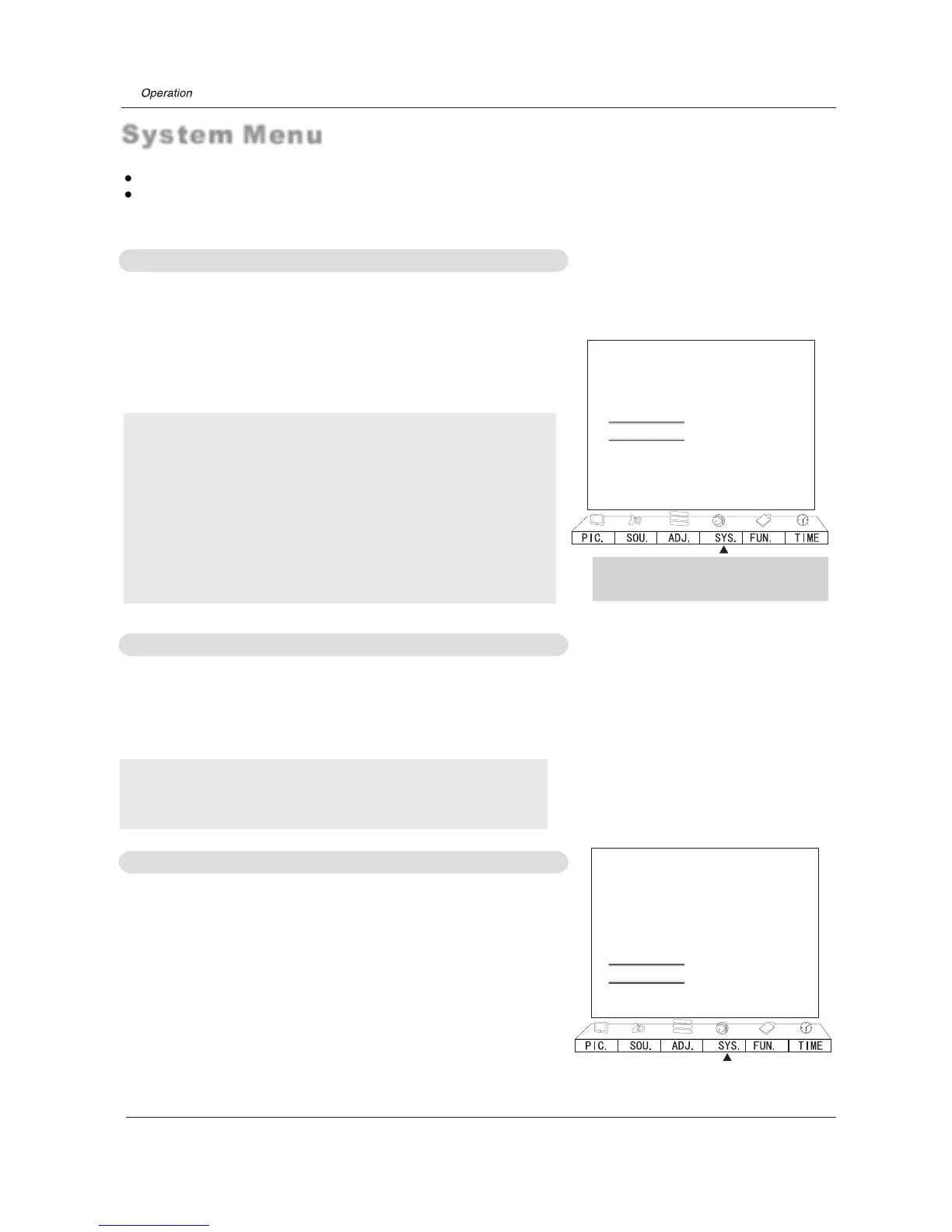 1 Press MENU button and then use VOL+/- button to select the SYS. Menu.