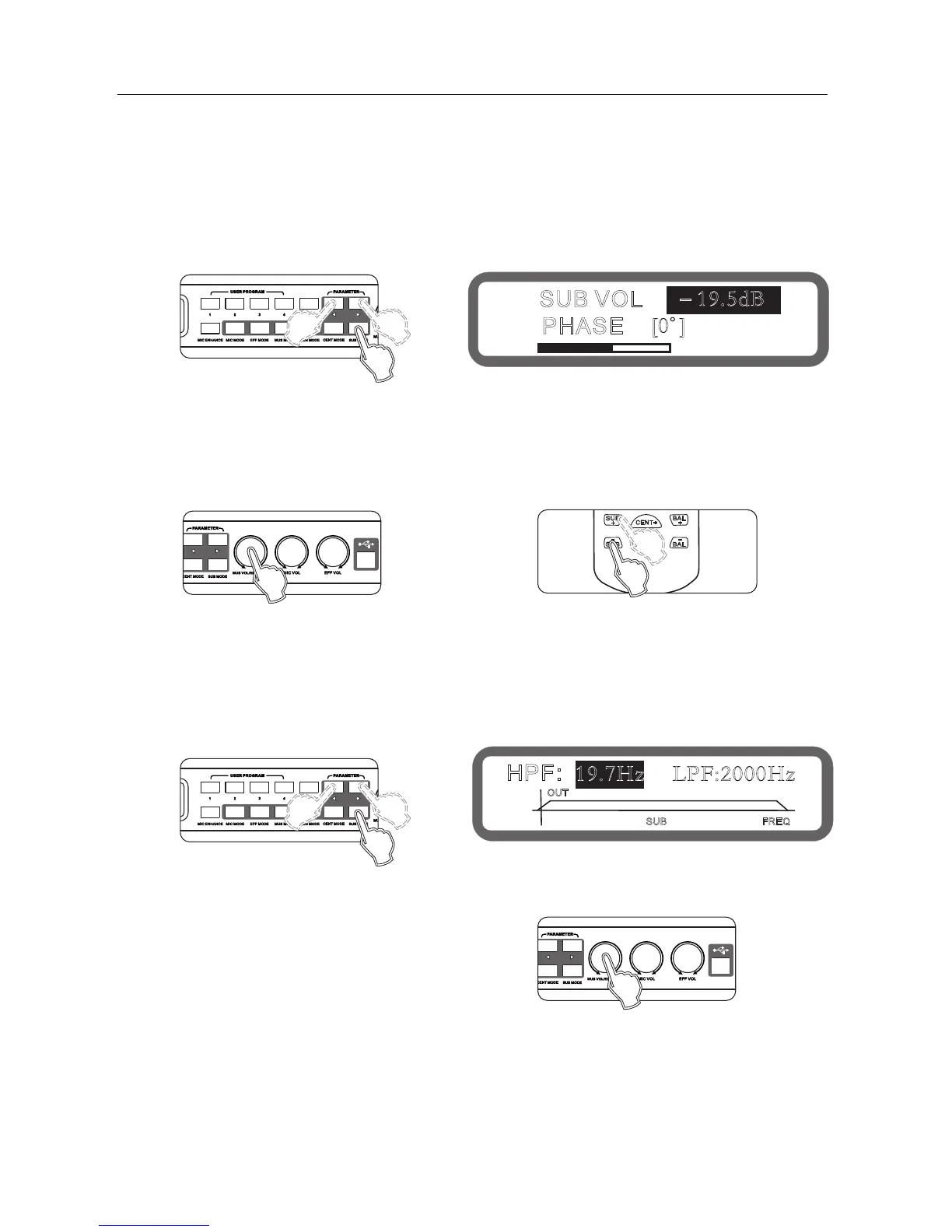 Operation method 1: Press the buttons "Sub Woofer Mode" on the panel continuously into the Low-cut and High-cut,